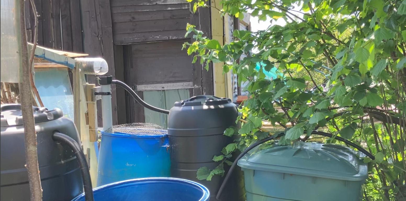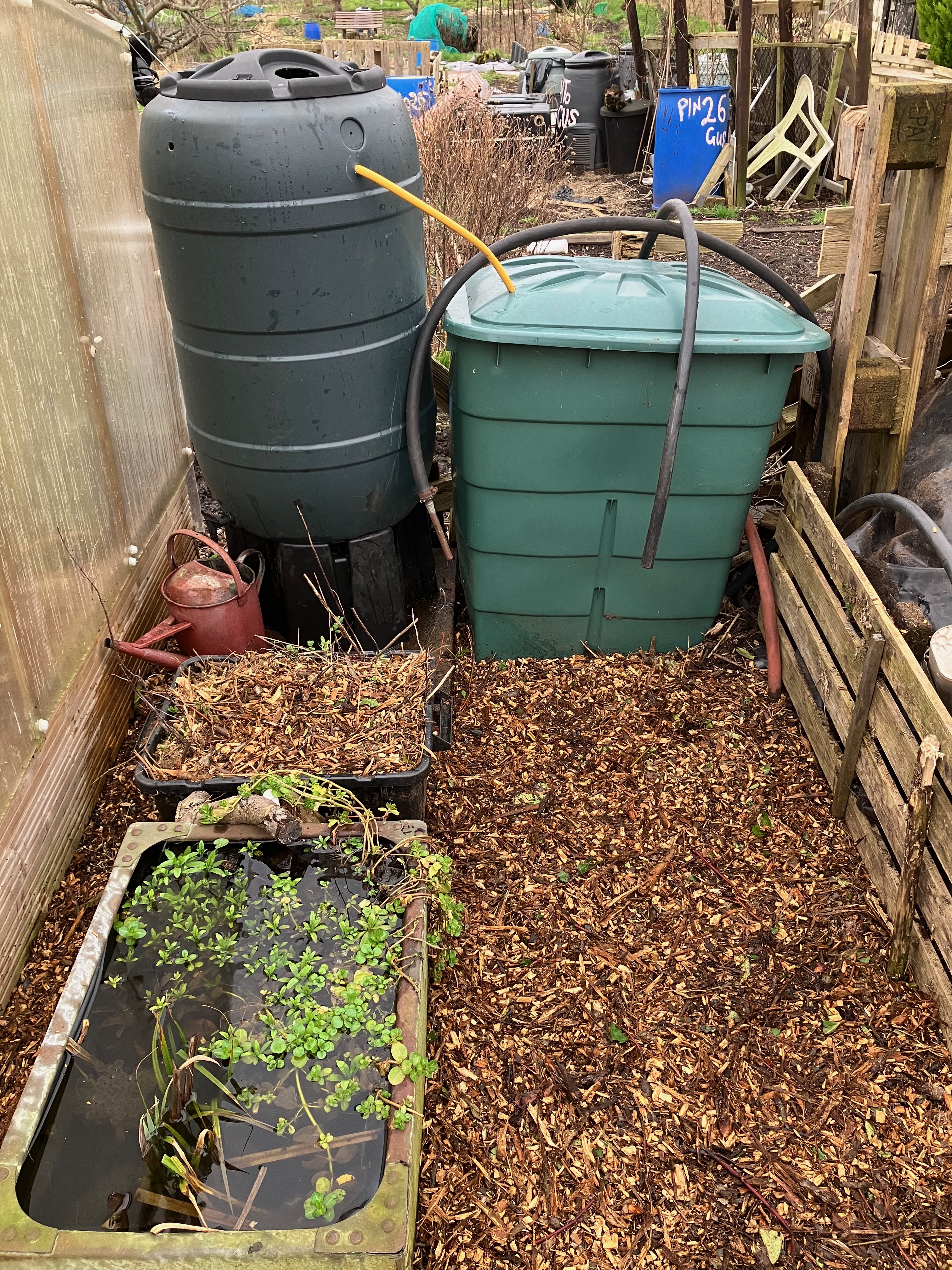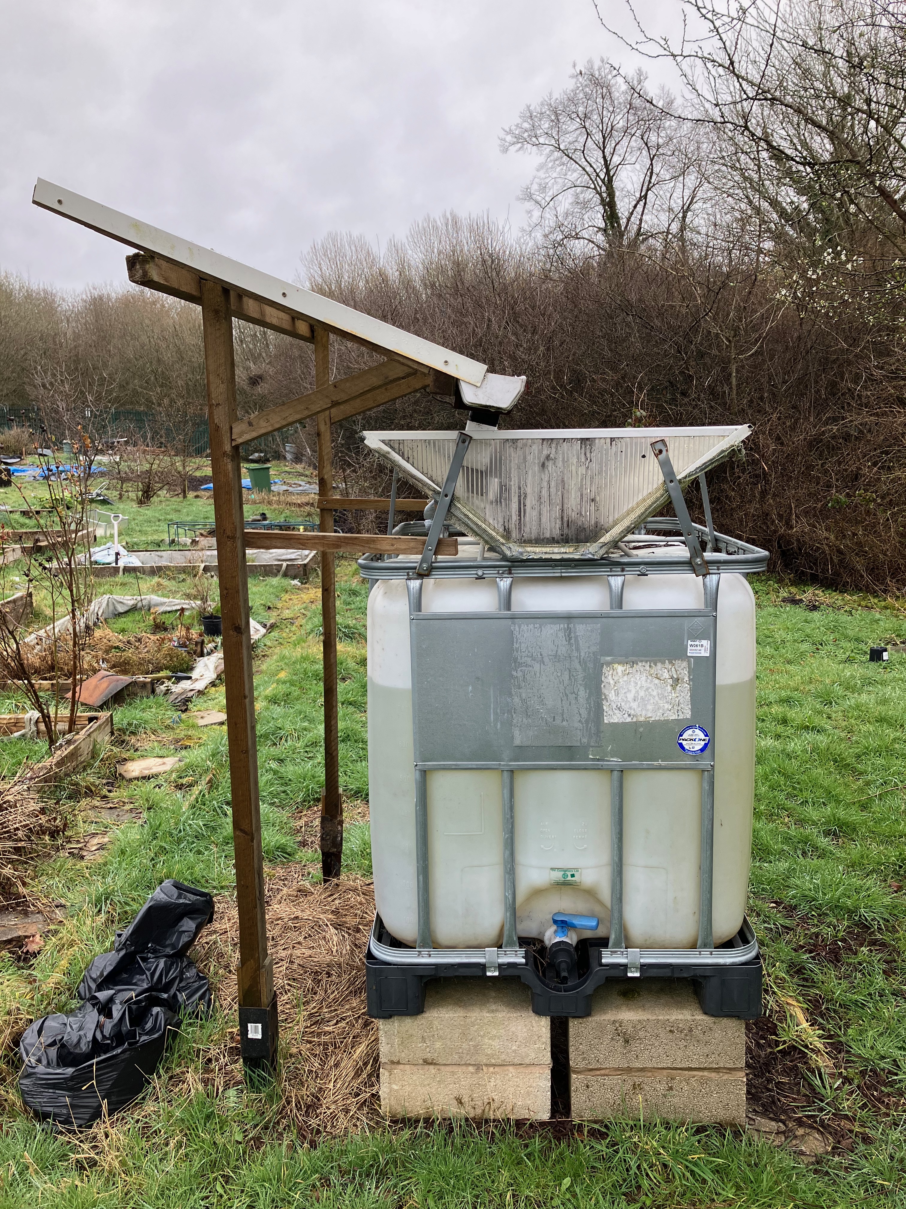 We found that, out of 41 plots (some of which are split into 2 x half-plots) there is a building (either a shed and/or greenhouse) on 35 plots. Of these, only about 5 plots are set up to collect and store significant quantities of rainwater.