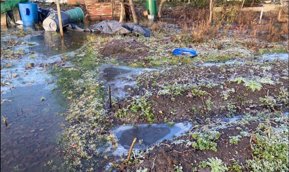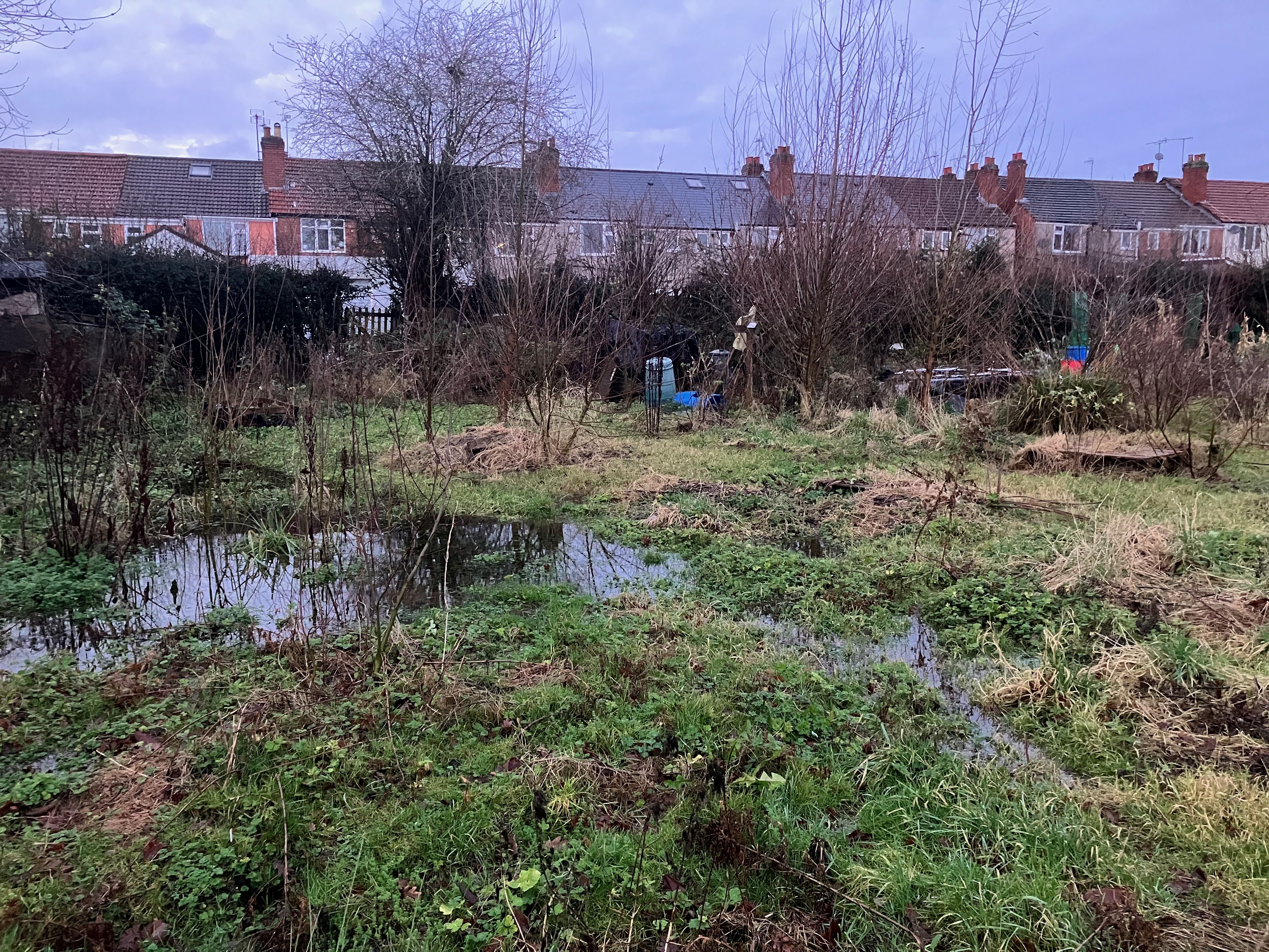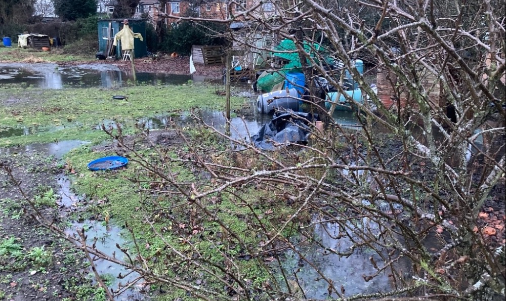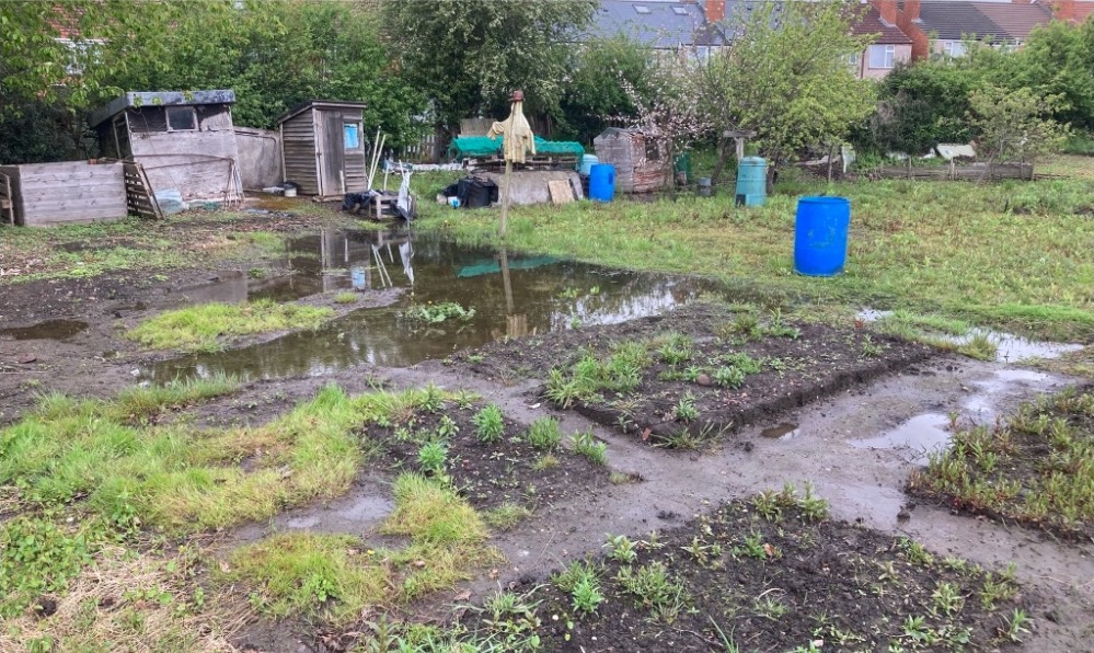 Over a 4 or 5 year period, waterlogging on the site has become increasingly problematic. It’s a problem across the lower part of the site, but most pronounced in a row of four plots that sit between a medieval well and the valley of the River Sherbourne. We *think* the water table has been getting higher outside of the allotments too, because a huge and magnificent copper beech that sat in a nearby garden was finally felled early in 2023 after several years of looking more and more sickly.