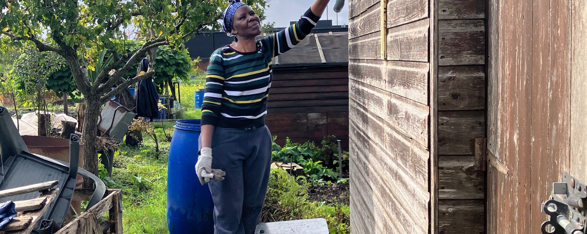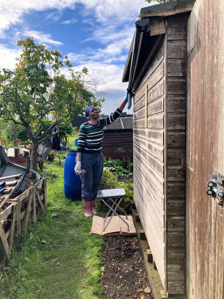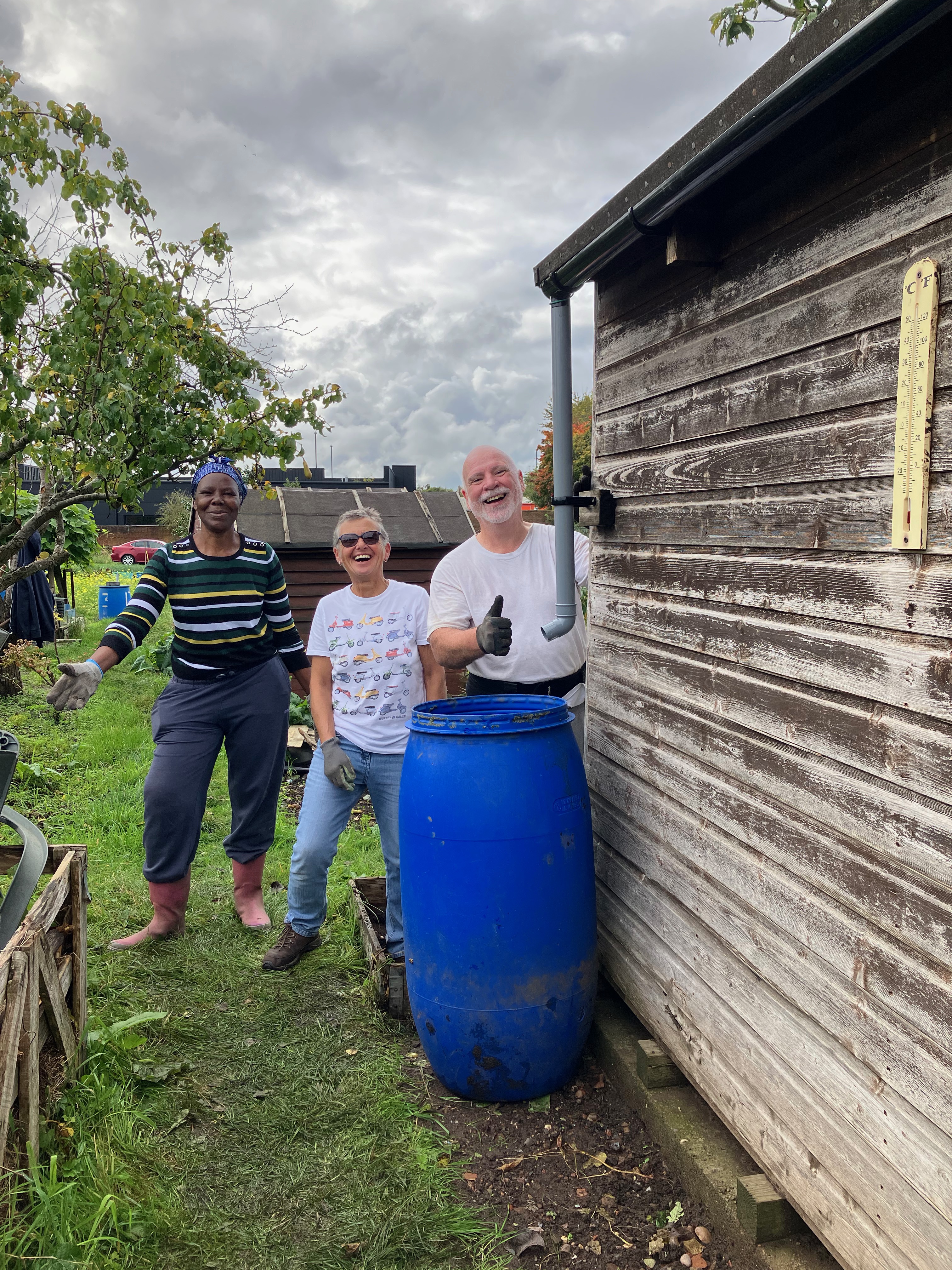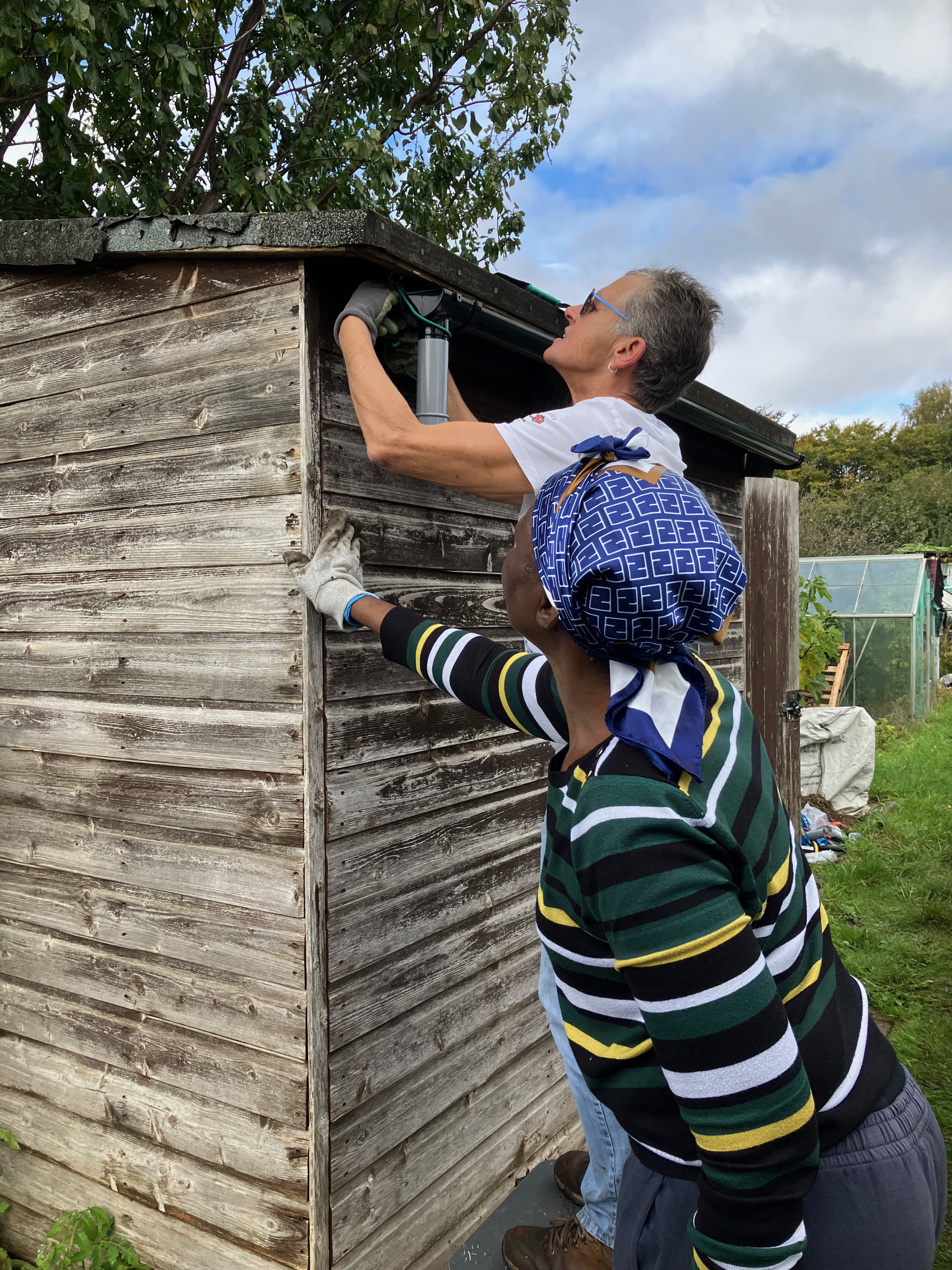 This morning’s working party connected new guttering and downpipe to the shed on Plot 23 to collect rainwater running off the roof.