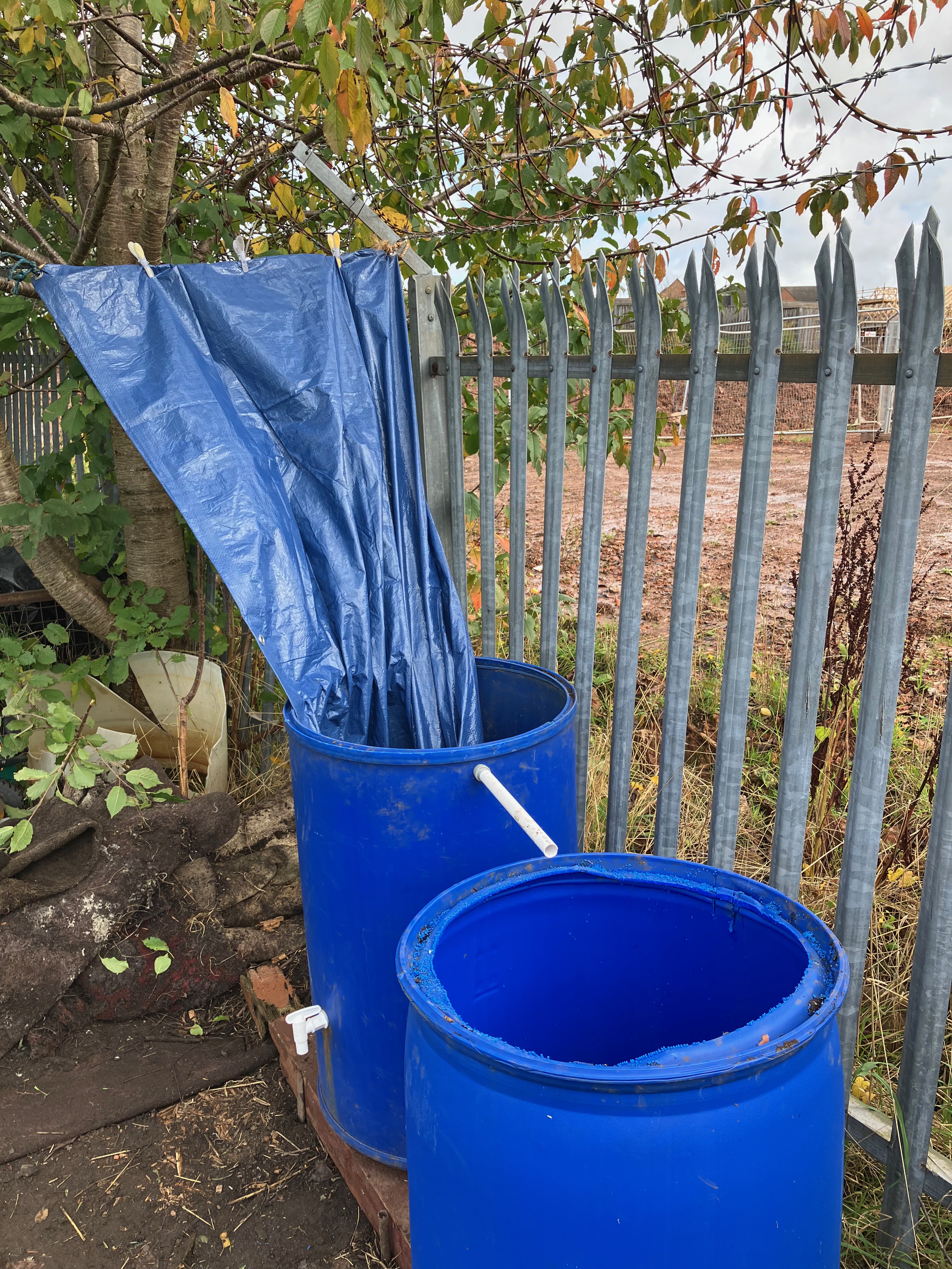We’re going to see how effective the tarpaulin is – we will replace it with something a bit more rigid if necessary. One of the barrels had a pipe rusted through it – we managed to remove the pipe, drill the hole a bit bigger and insert a plastic tap. So that the tap can be used to fill a watering can, we needed to raise the barrel up off the ground – luckily we found some solid fence posts to do this job.