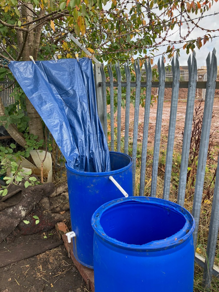On Plot 12, which has no buildings from which to harvest rainwater, we rigged up a tarpaulin between the boundary fence and a fence post on the plot, facing the prevailing wind/rain. We hope this will collect and channel rain into two barrels that we daisy-chained together with an overflow pipe.