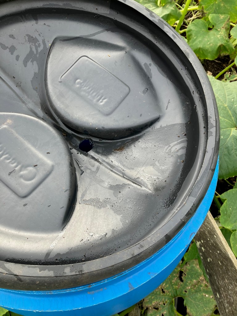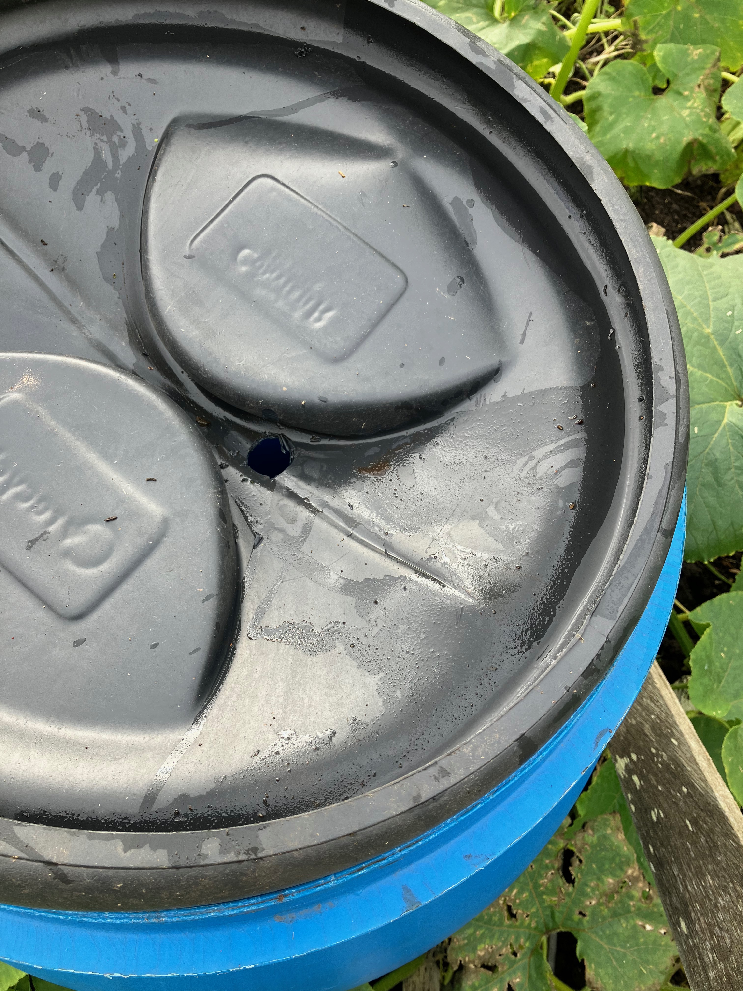 We also put a hole in a upturned spare lid to help channel the water it collects into the barrel below (right hand picture).