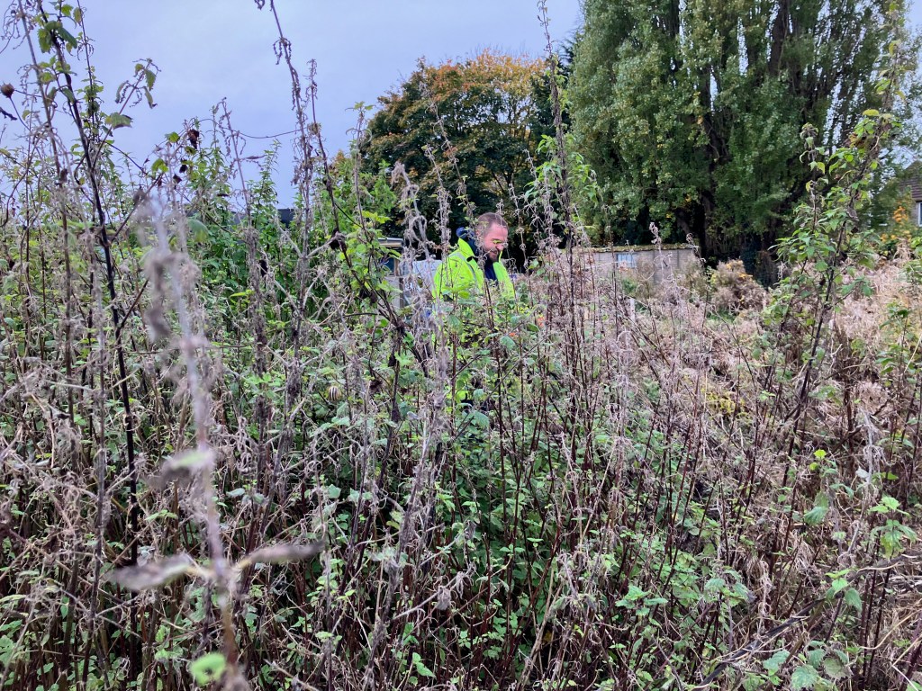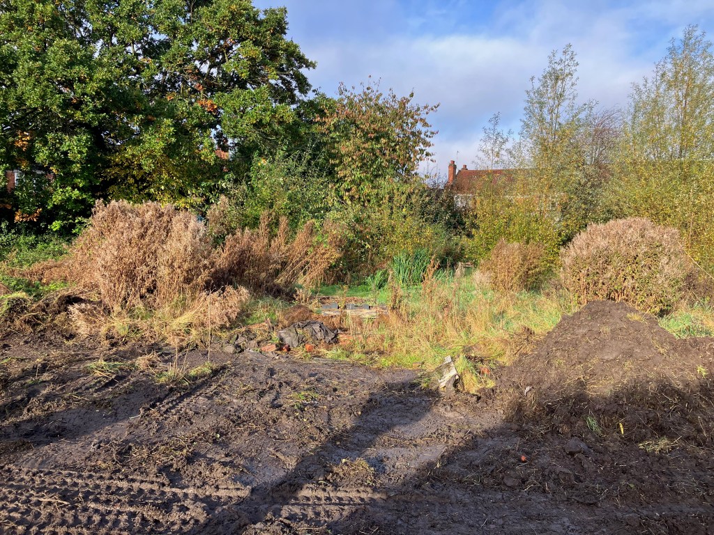 We’re working with a local landscape contractor to help us prepare the site for the raised beds and to build the skeleton of the communal shelter (to ensure the basis of the structure is safe!). Andy, Darren and Jude started on site today and, in just a morning, the visual impact is huge! In an ideal world, we’d have enough person-power to manually clear this area, but the area is so huge we’ve just had to get a bit of powered help. Before they started, though, we did a serious bit of froglet-herding and moved creatures to safety.