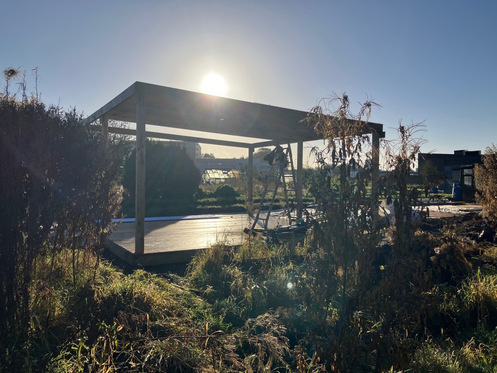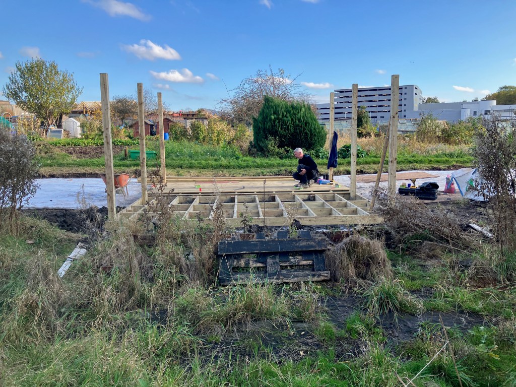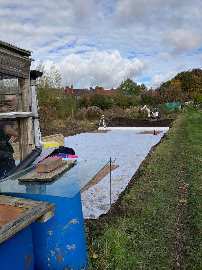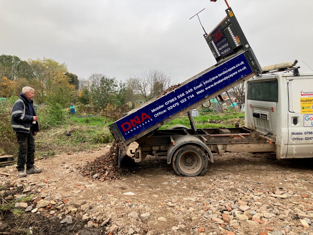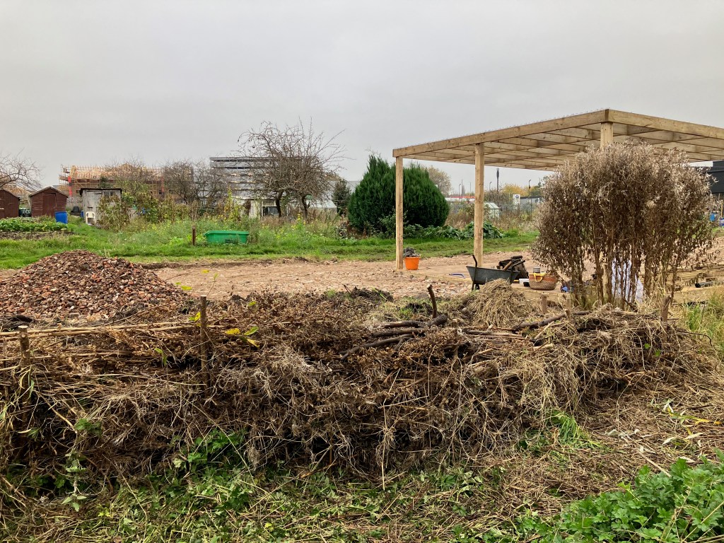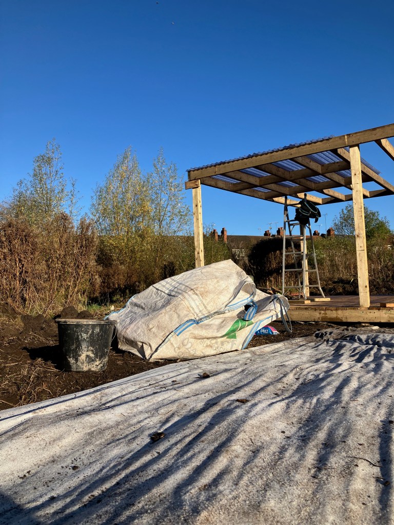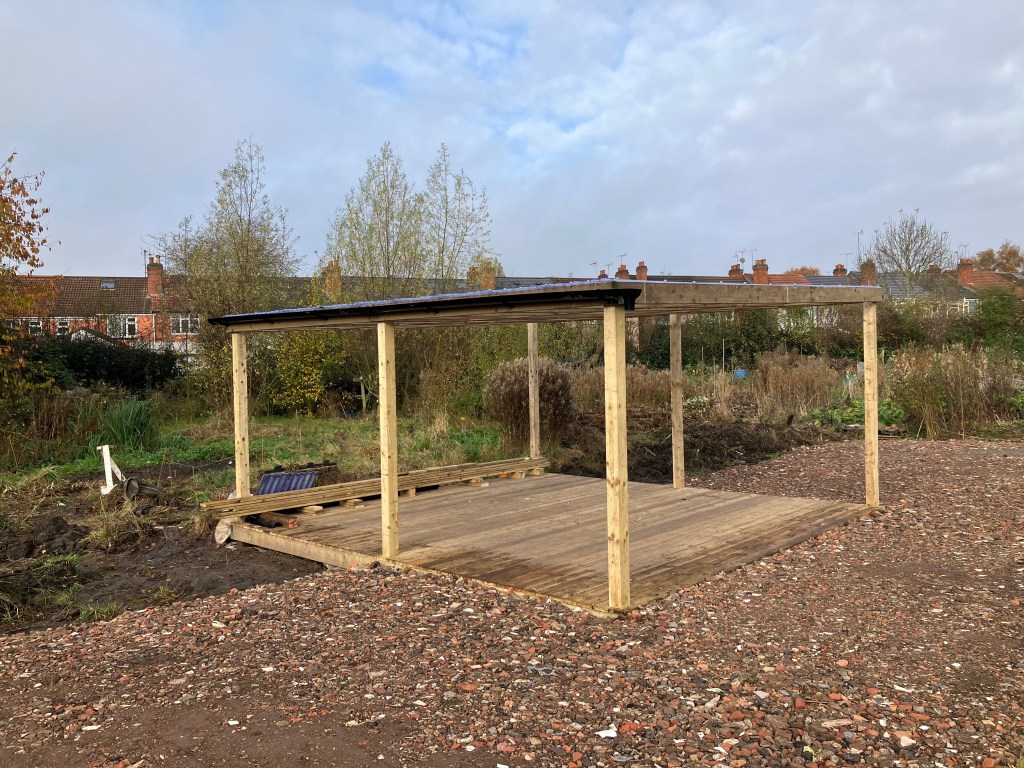 We’re really pleased with the gazebo structure – we have plans (over time, and as we find or acquire materials) to build walls into it, to give us all a bit more shelter. The hardcore forms a solid, free-draining base which is where our raised beds will stand, and people who want to be part of an urban food-growing community will be able to just rent one or two of those before (or instead of) committing to a full plot.