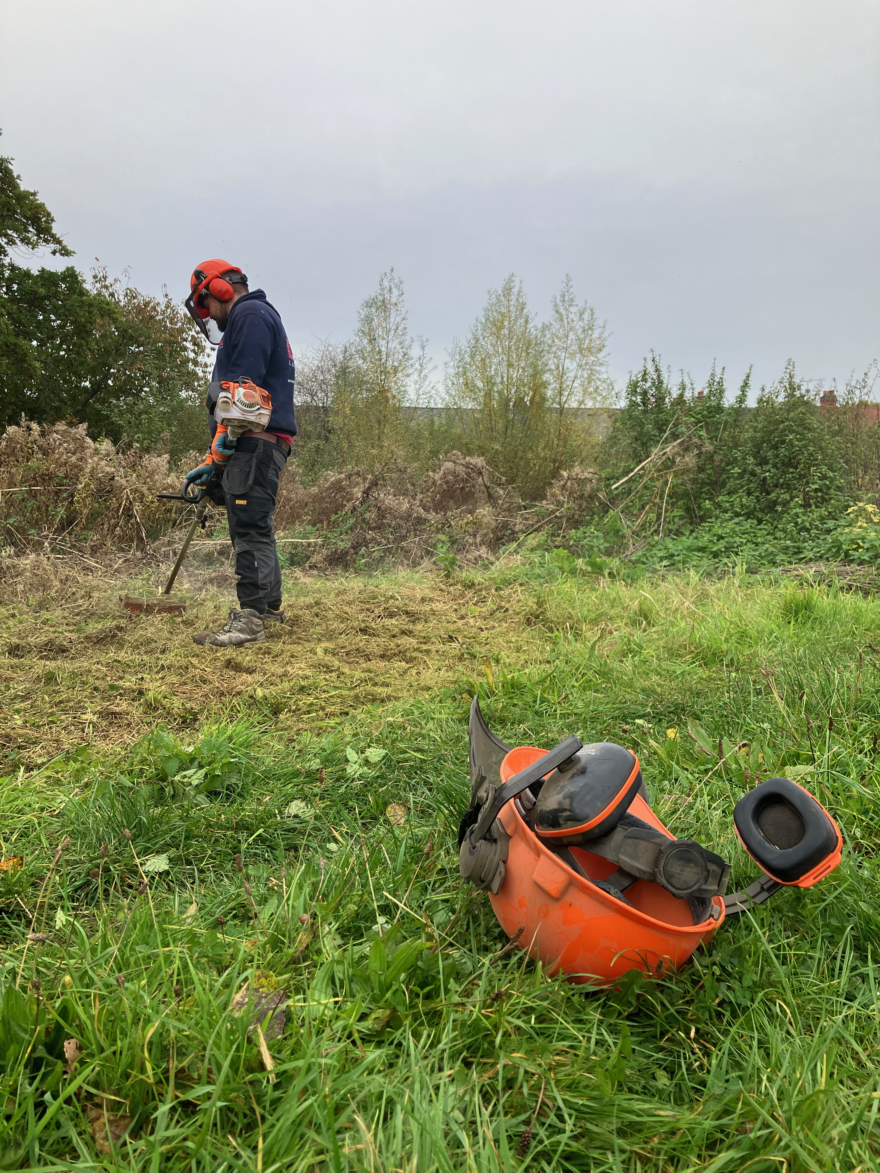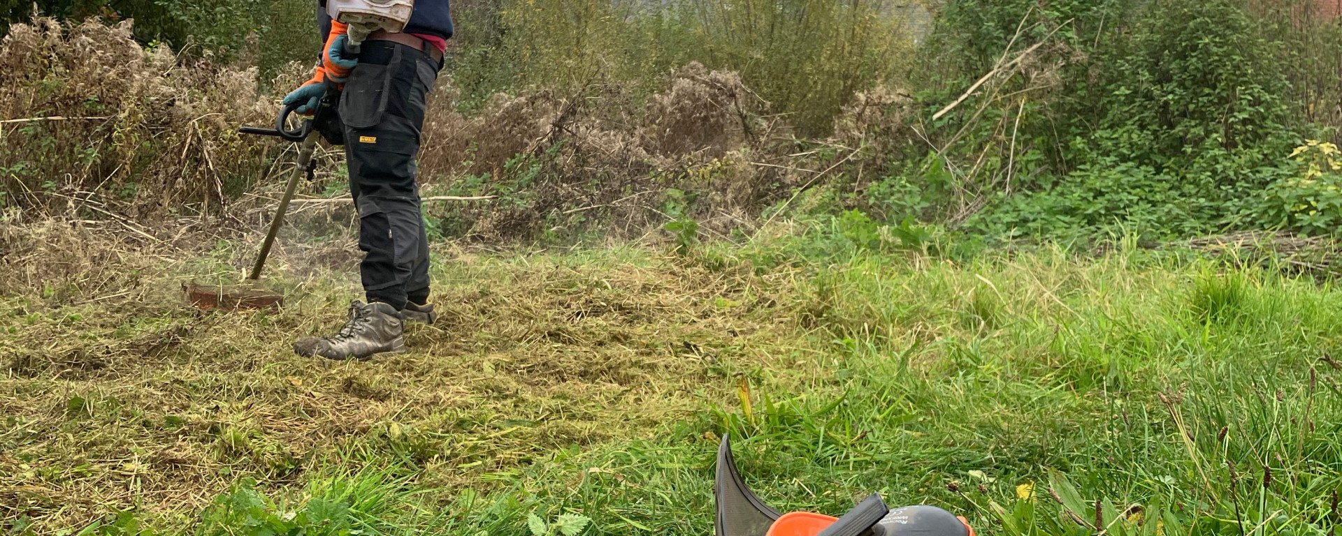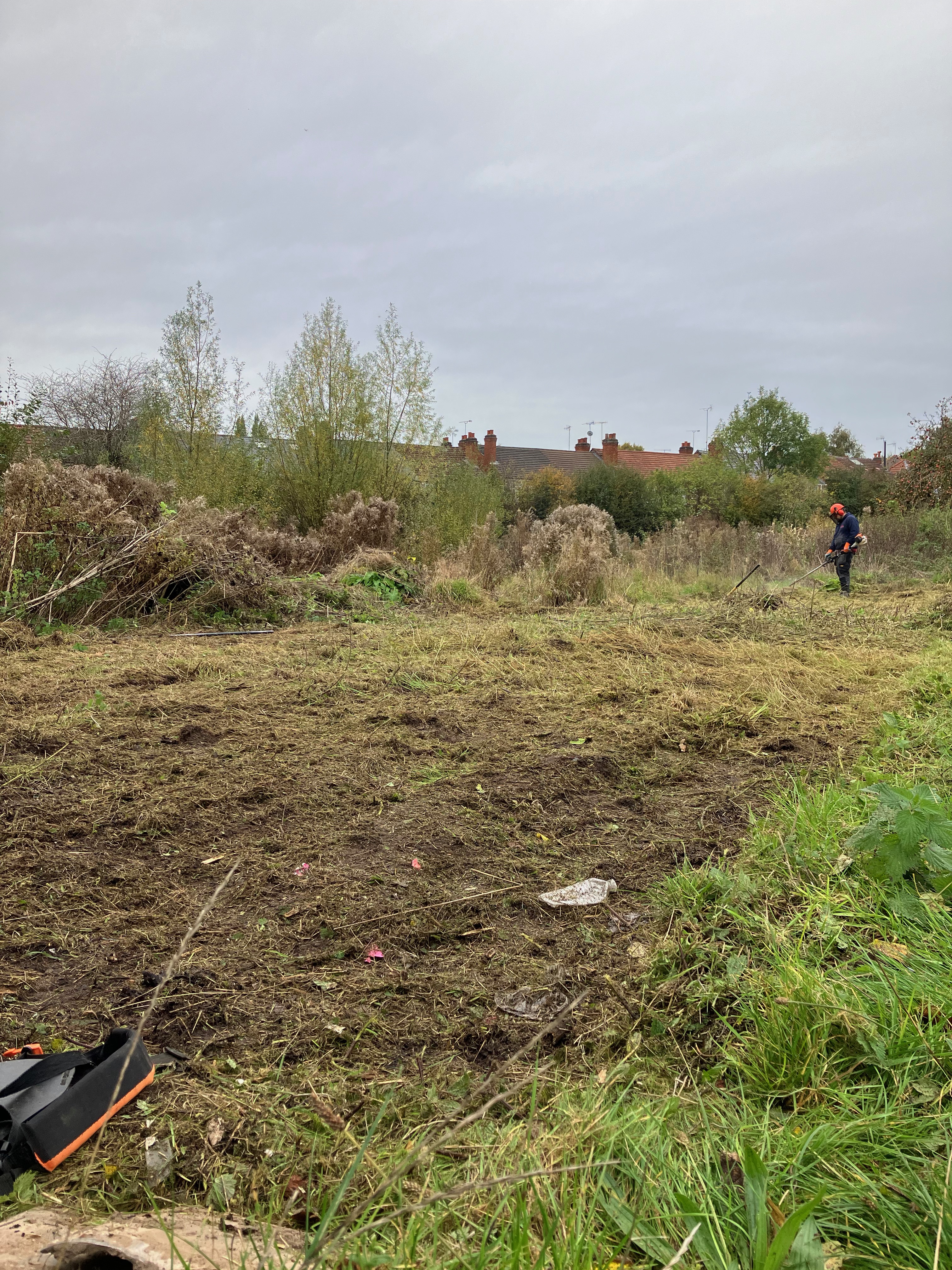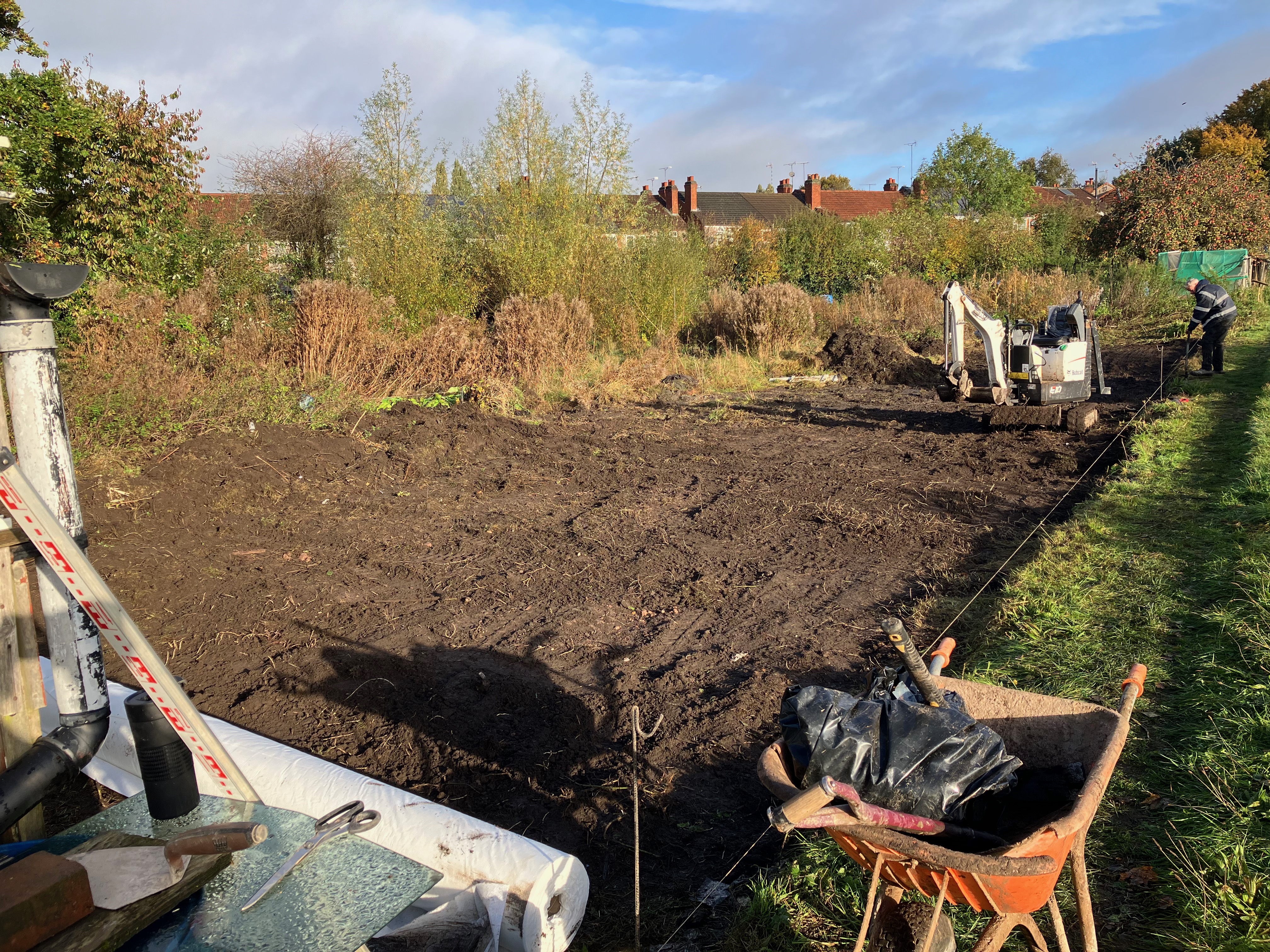We’re working with a local landscape contractor to help us prepare the site for the raised beds and to build the skeleton of the communal shelter (to ensure the basis of the structure is safe!). Andy, Darren and Jude started on site today and, in just a morning, the visual impact is huge! In an ideal world, we’d have enough person-power to manually clear this area, but the area is so huge we’ve just had to get a bit of powered help. Before they started, though, we did a serious bit of froglet-herding and moved creatures to safety.