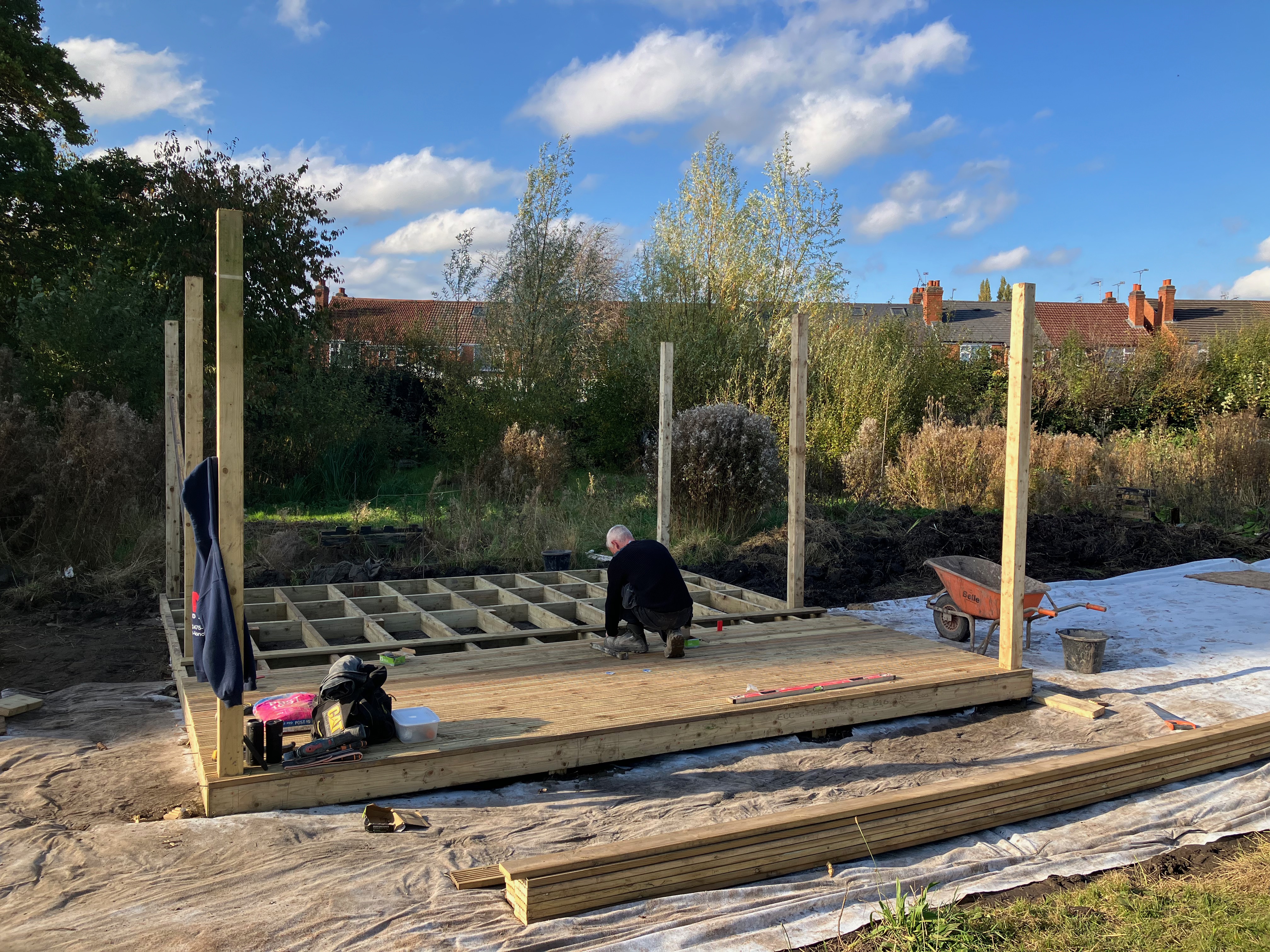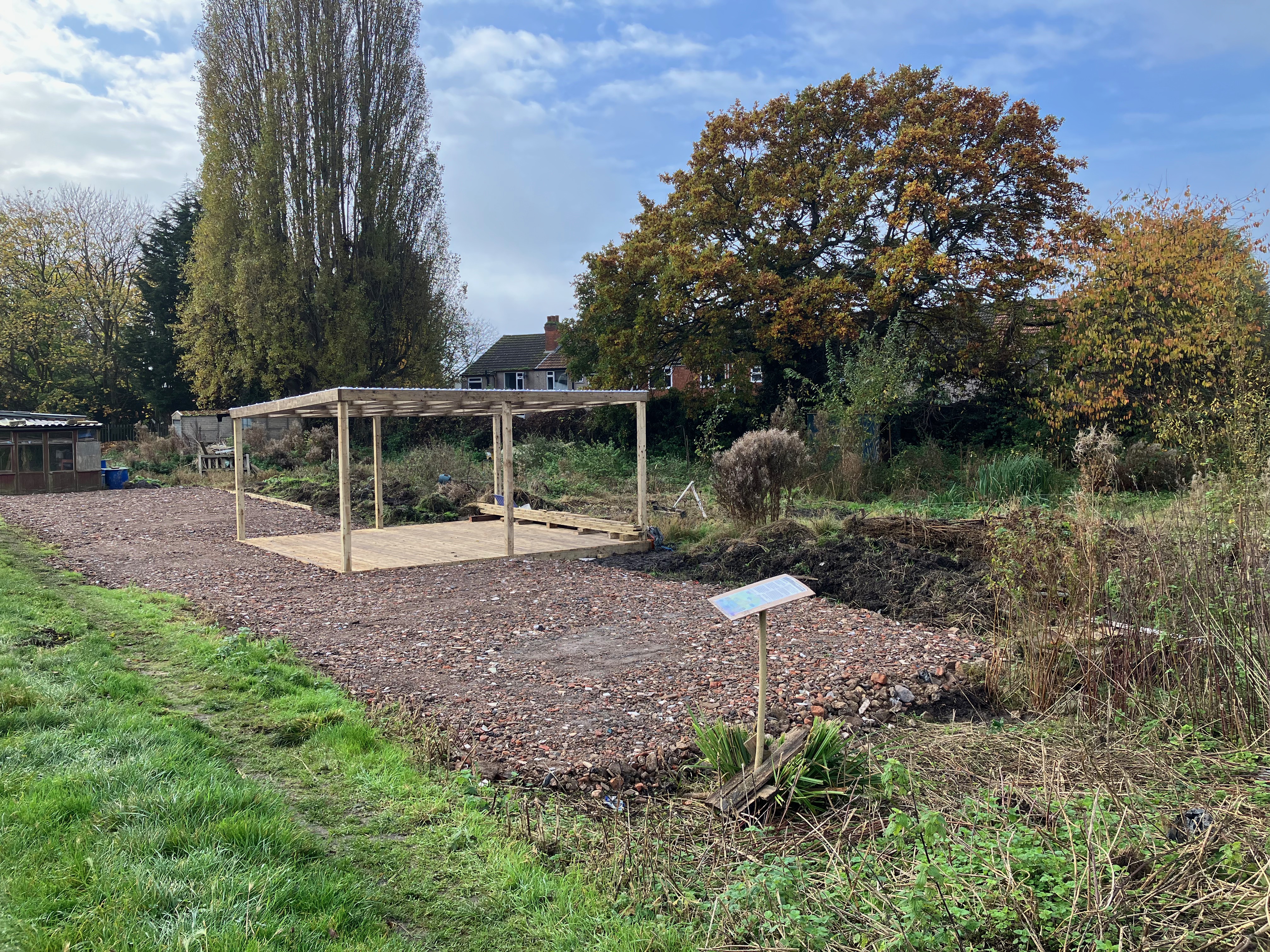 We’re really pleased with the gazebo structure – we have plans (over time, and as we find or acquire materials) to build walls into it, to give us all a bit more shelter. The hardcore forms a solid, free-draining base which is where our raised beds will stand, and people who want to be part of an urban food-growing community will be able to just rent one or two of those before (or instead of) committing to a full plot.