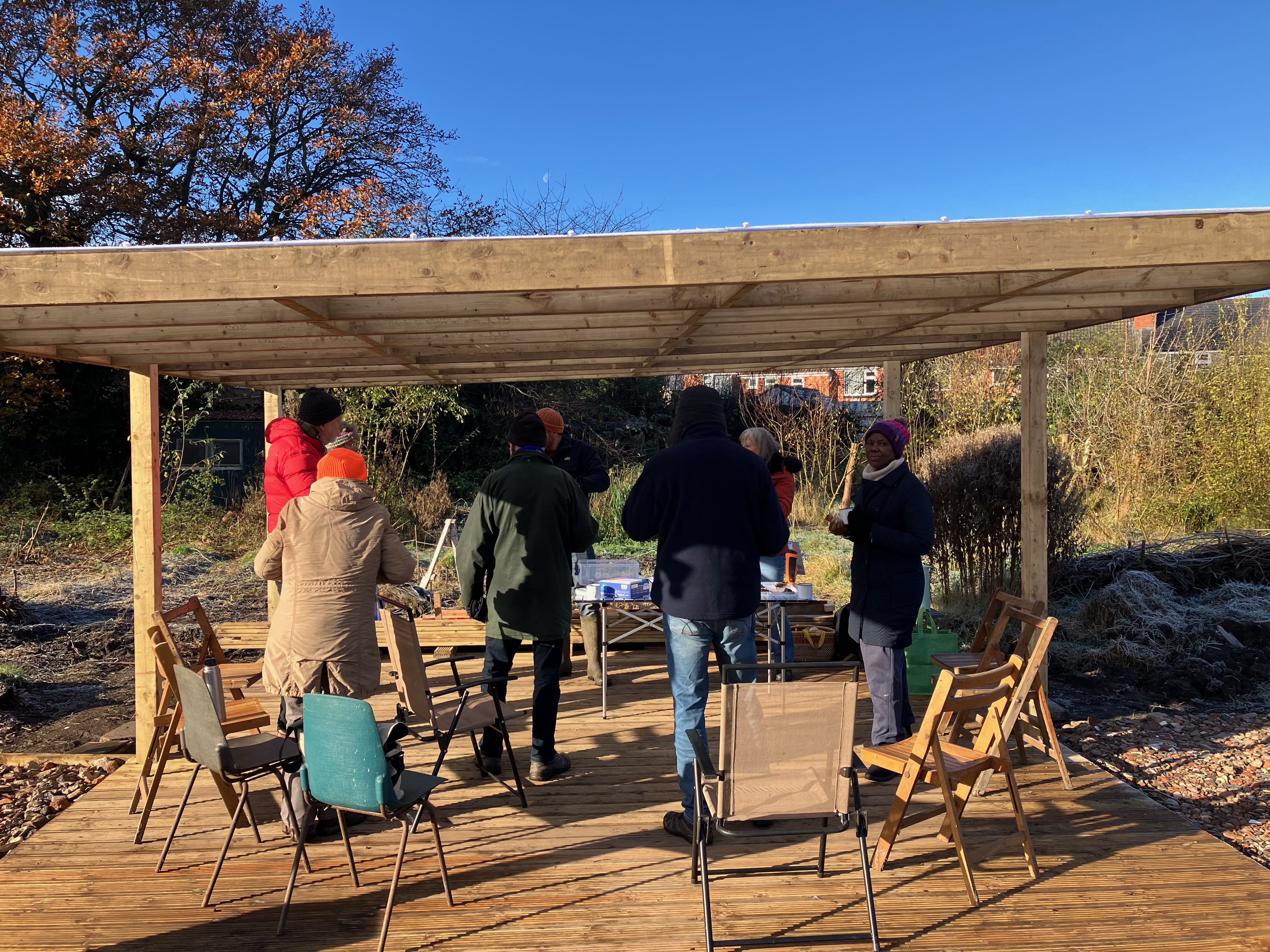Today’s event was also the official ‘christening’ of our community shelter, which now gives us a space to gather and learn together on site. We spent the first part of the morning in there, cradling hot drinks and sharing our own composting habits (which ranged from methodical to haphazard!). John talked to us about how he views making compost as both a science and an art, and reassured us that successful composting is really about making sure you don’t have too much of one thing in your compost – but ensuring there is a mix of green (nitrogen) and brown (carbon) materials – and plenty of aeration.