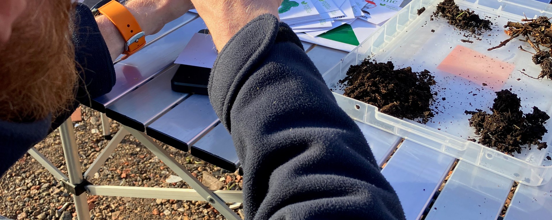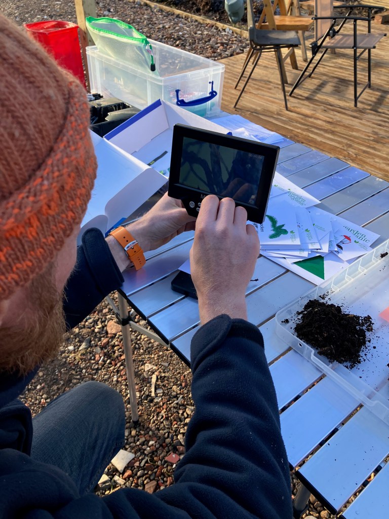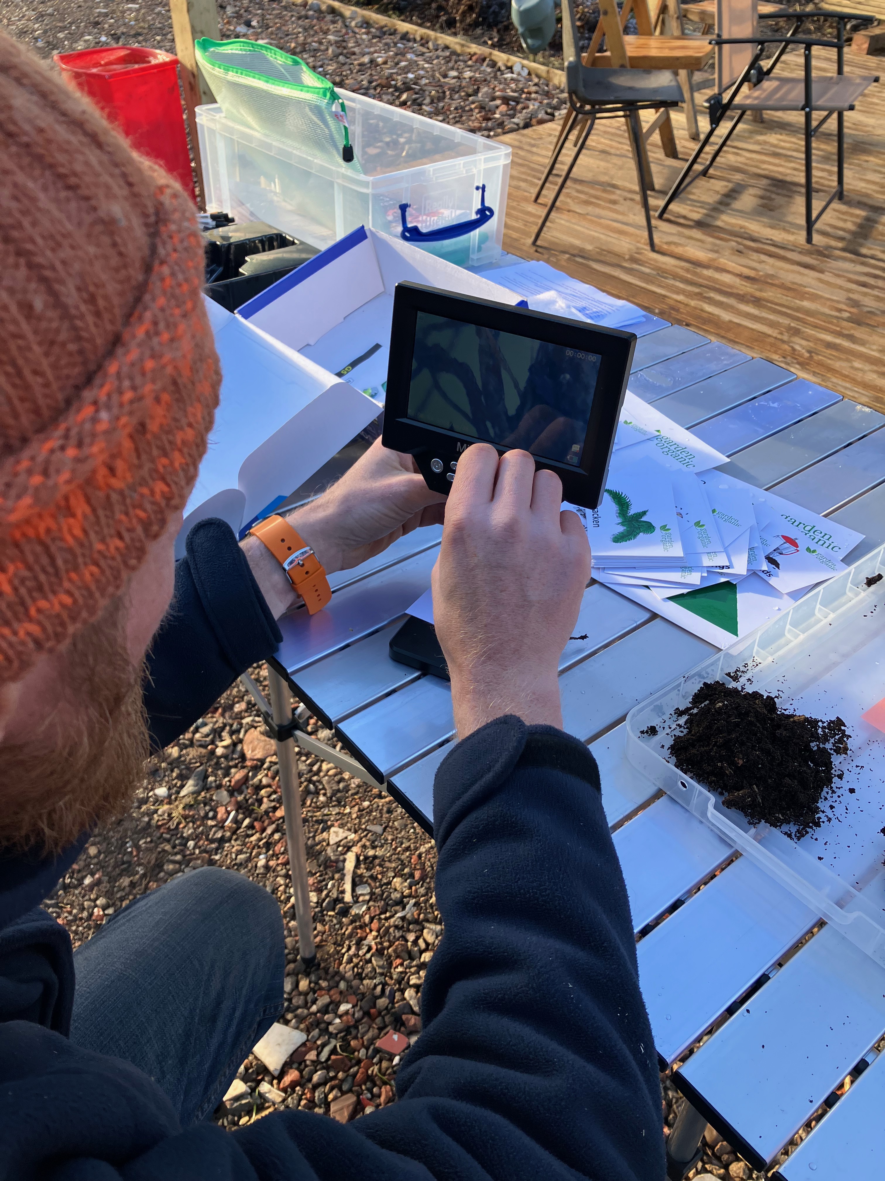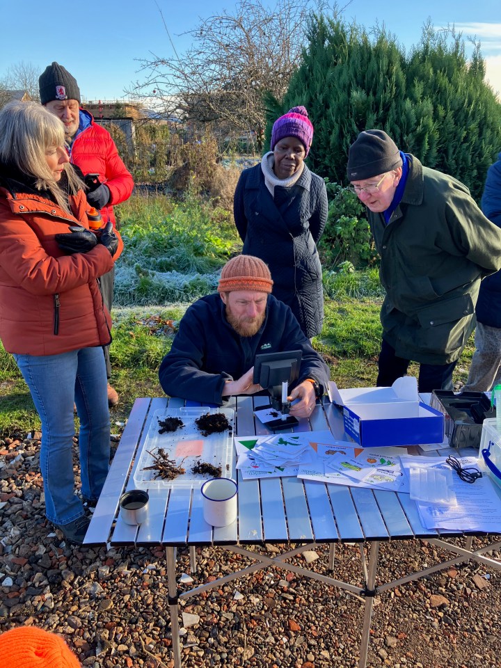 Partly to warm up, and partly because it’s much easier to demonstrate things with a look at real compost, we went for a walk around the site, poked our noses in a couple of compost bins, and collected a few samples which we then looked at under the microscope – although sadly (due to the cold) there wasn’t much activity to be seen.