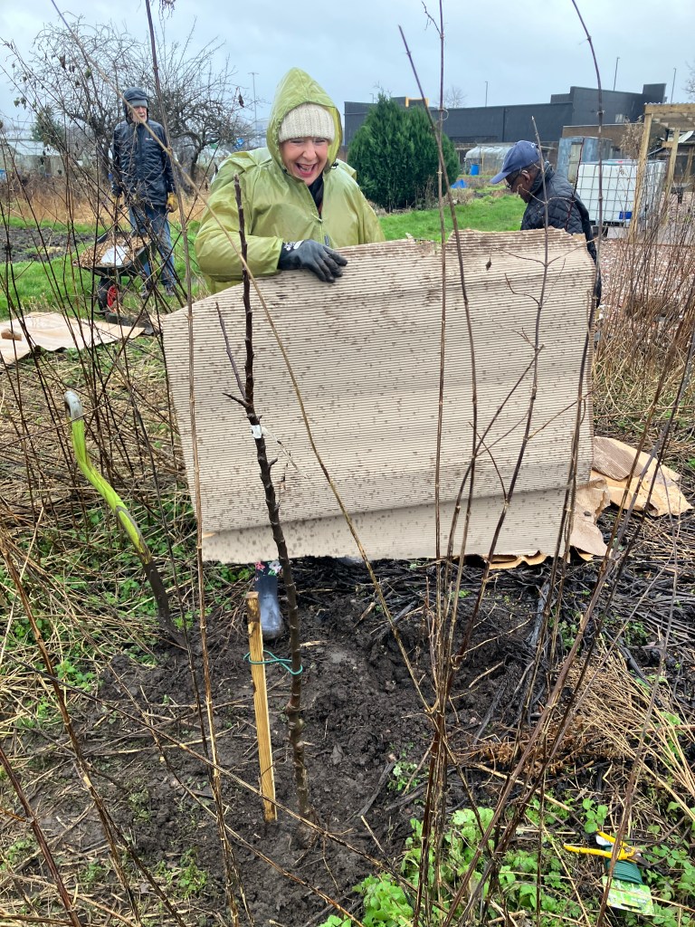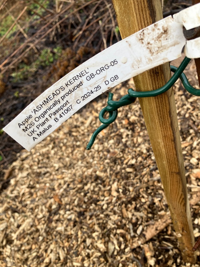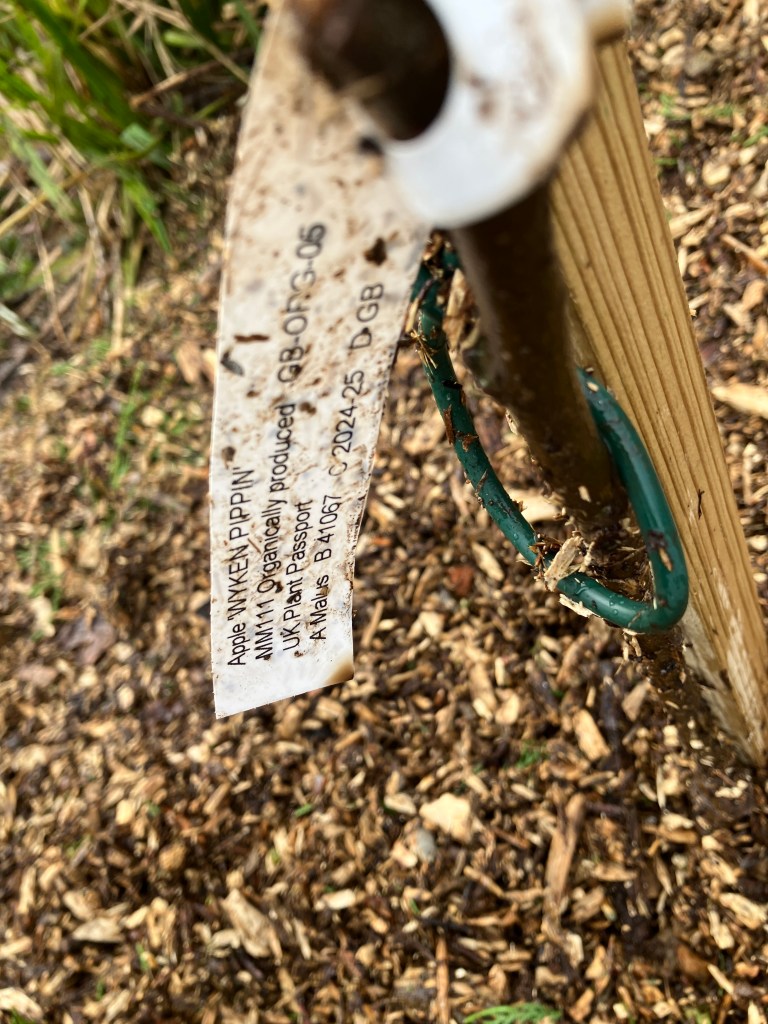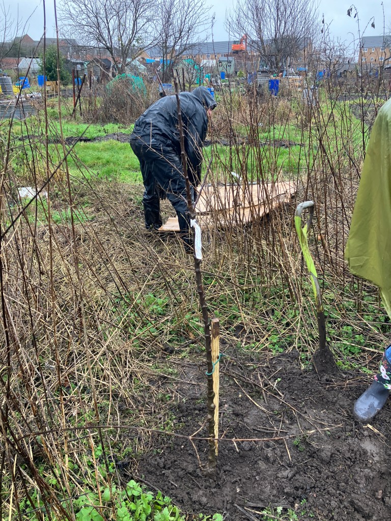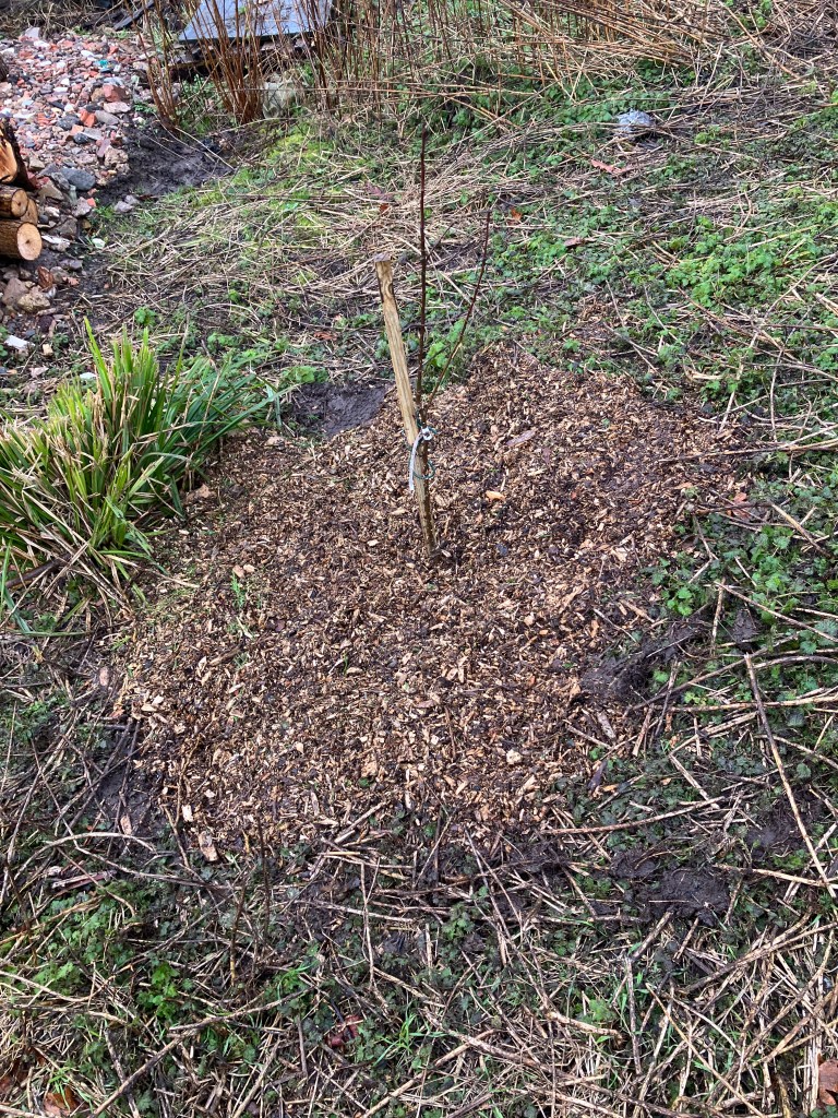 We planted the 3 apples and a crab apple tree in a little copse configuration, with a good layer of cardboard and woodchips to keep the weeds down around them. But time ran out and the weather carried on soaking us, so the gage and quince were also heeled in to a temporary home. Hopefully the weather will be a bit nicer for the next working party!