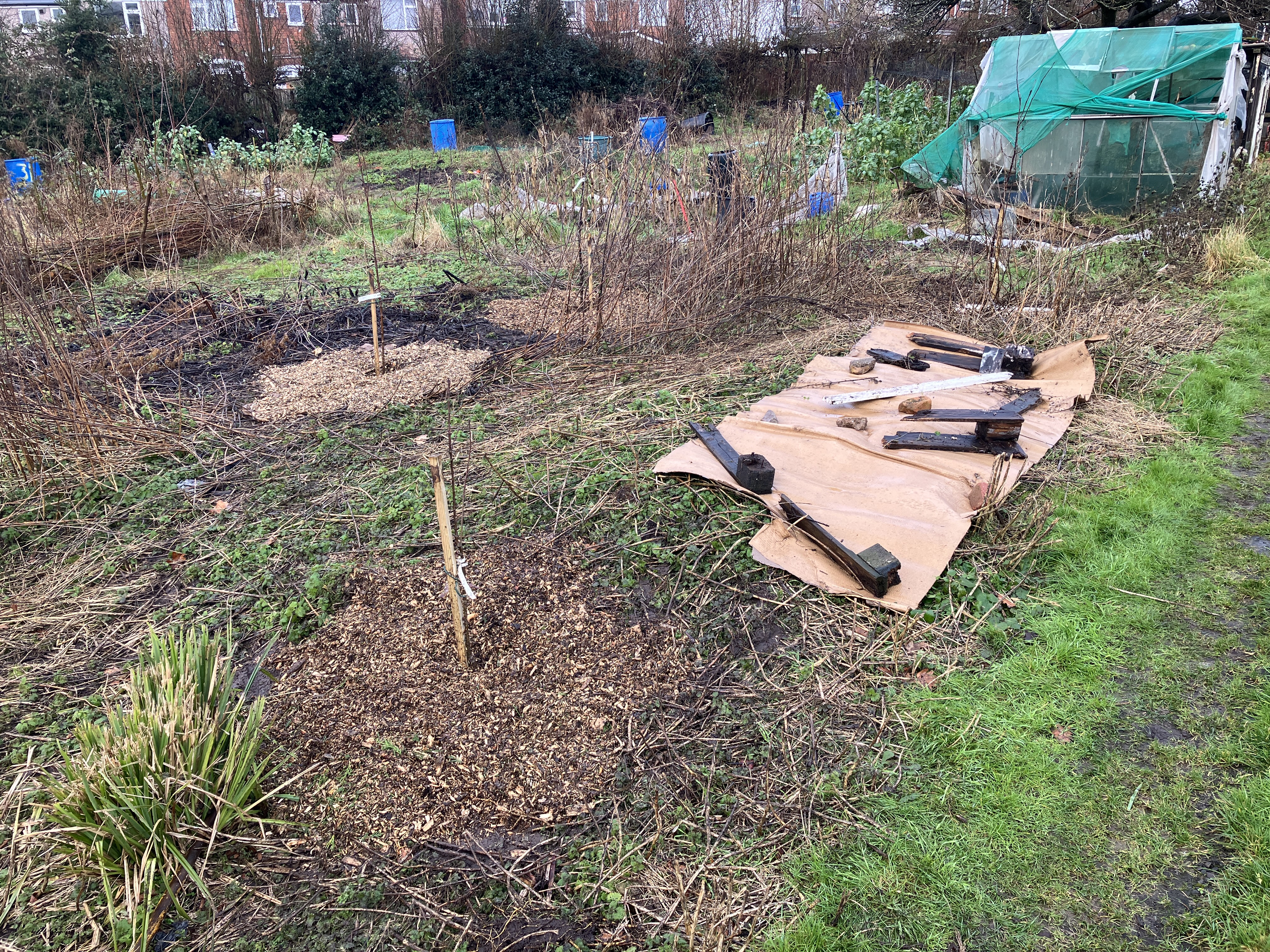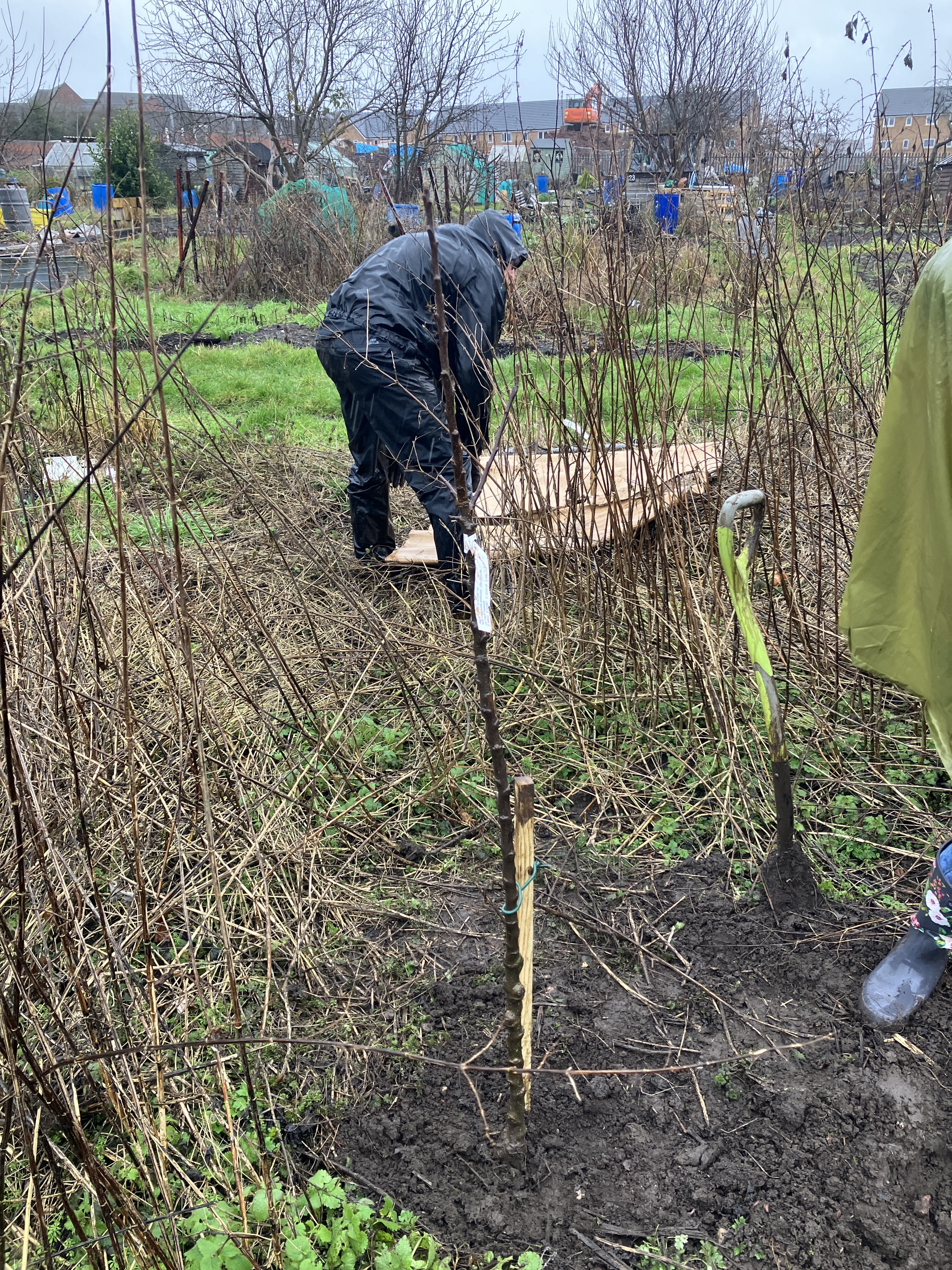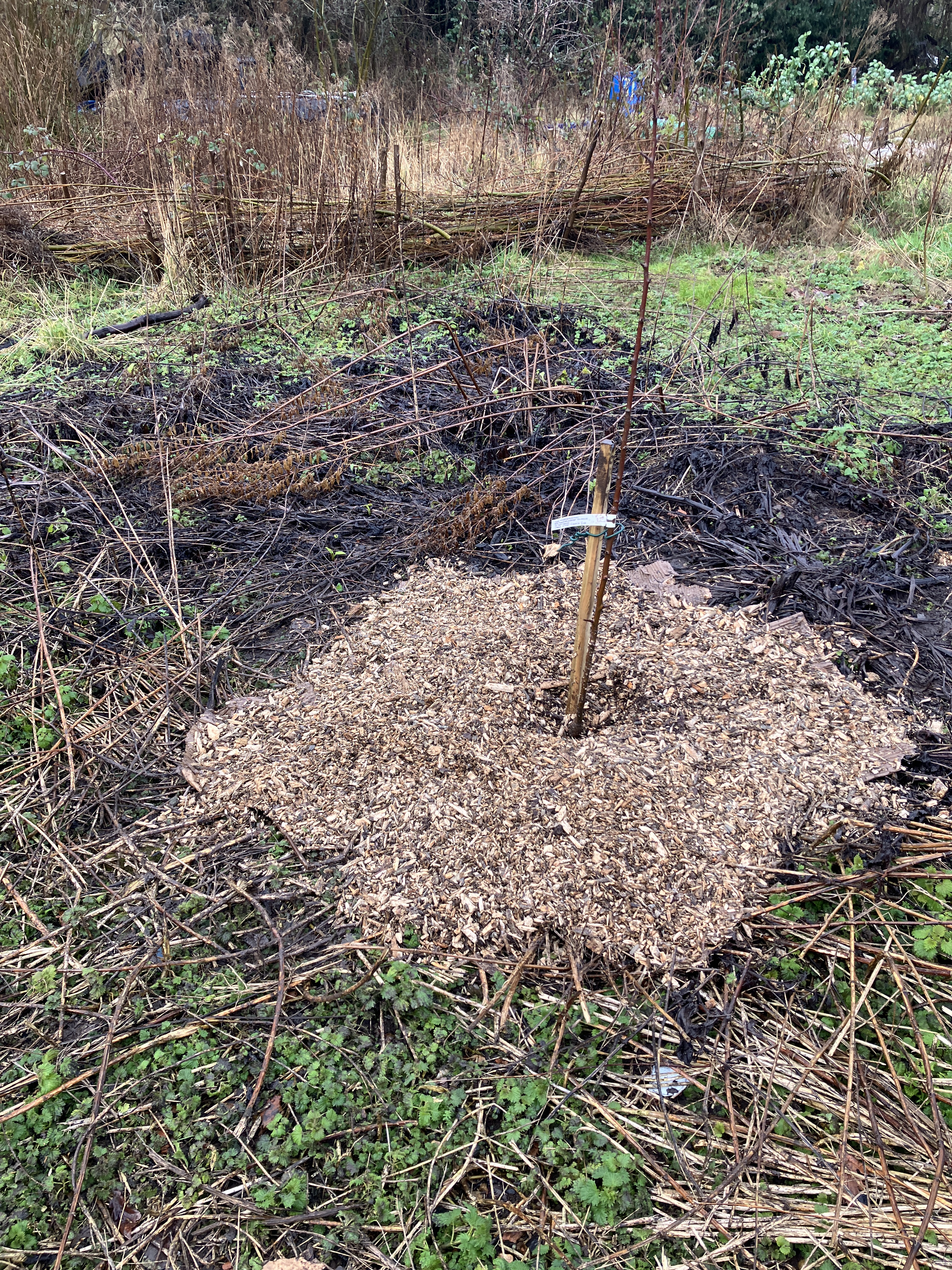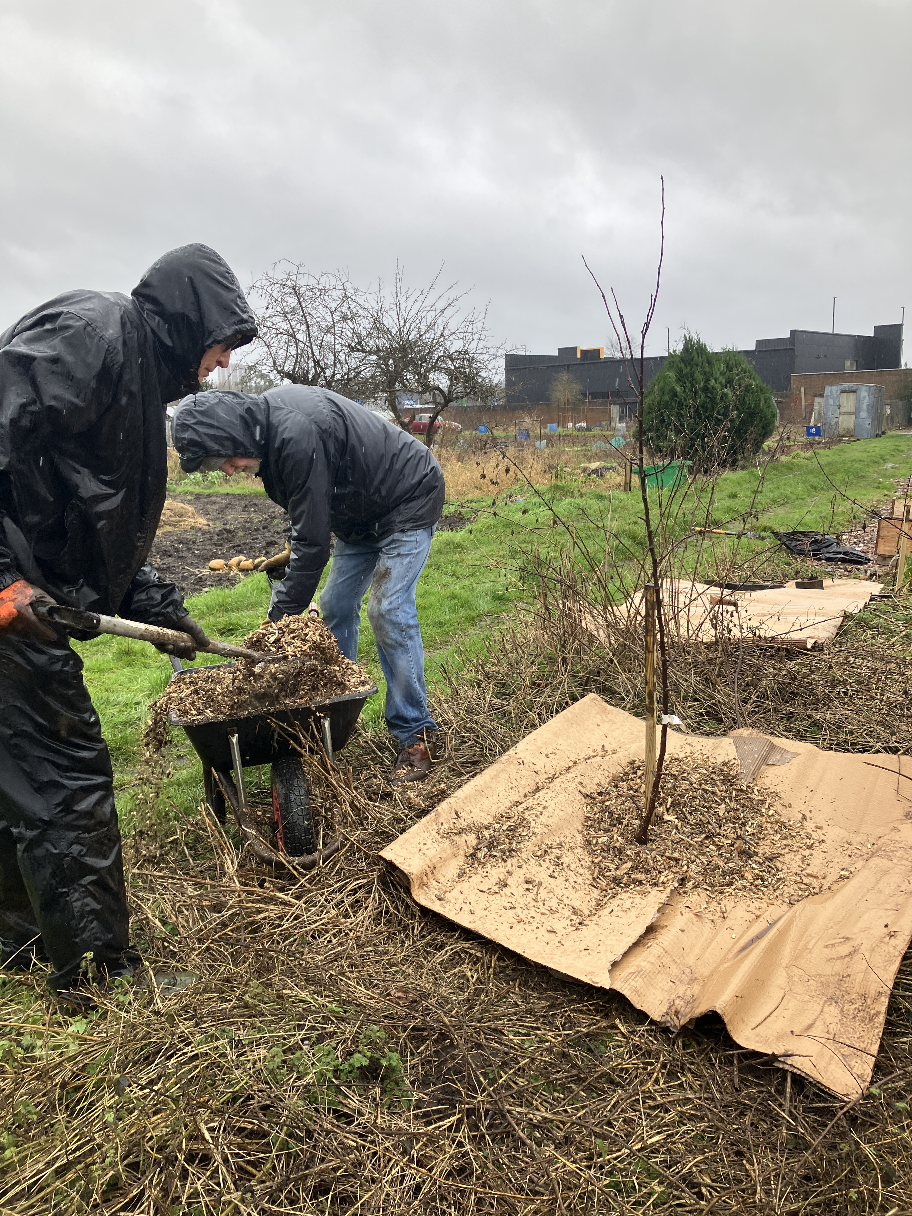 We planted the 3 apples and a crab apple tree in a little copse configuration, with a good layer of cardboard and woodchips to keep the weeds down around them. But time ran out and the weather carried on soaking us, so the gage and quince were also heeled in to a temporary home. Hopefully the weather will be a bit nicer for the next working party!