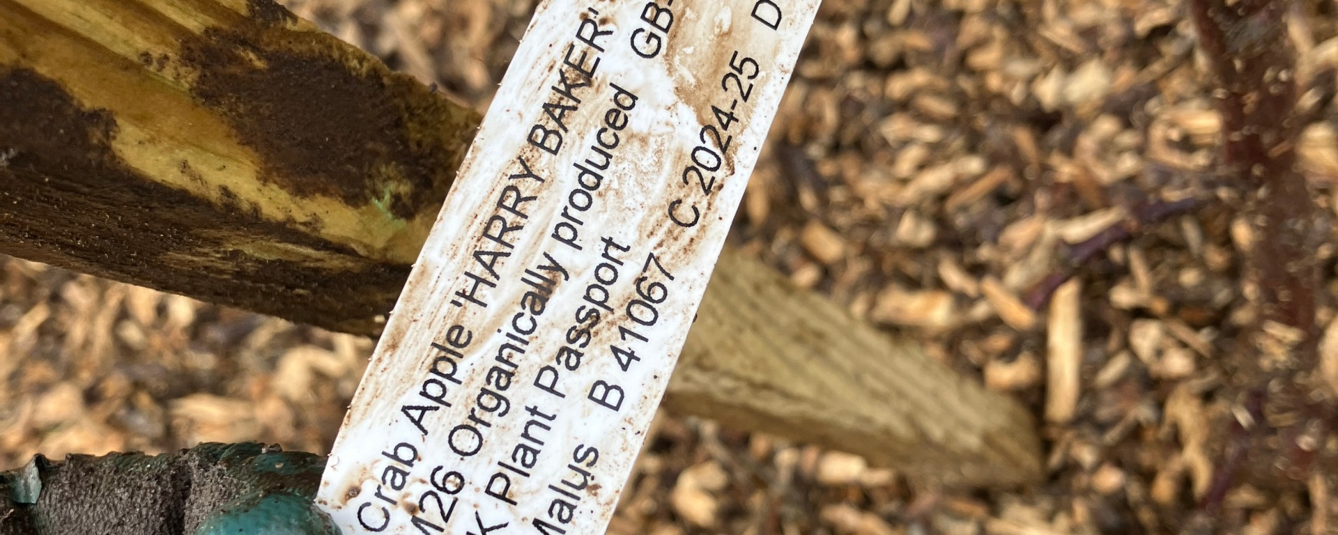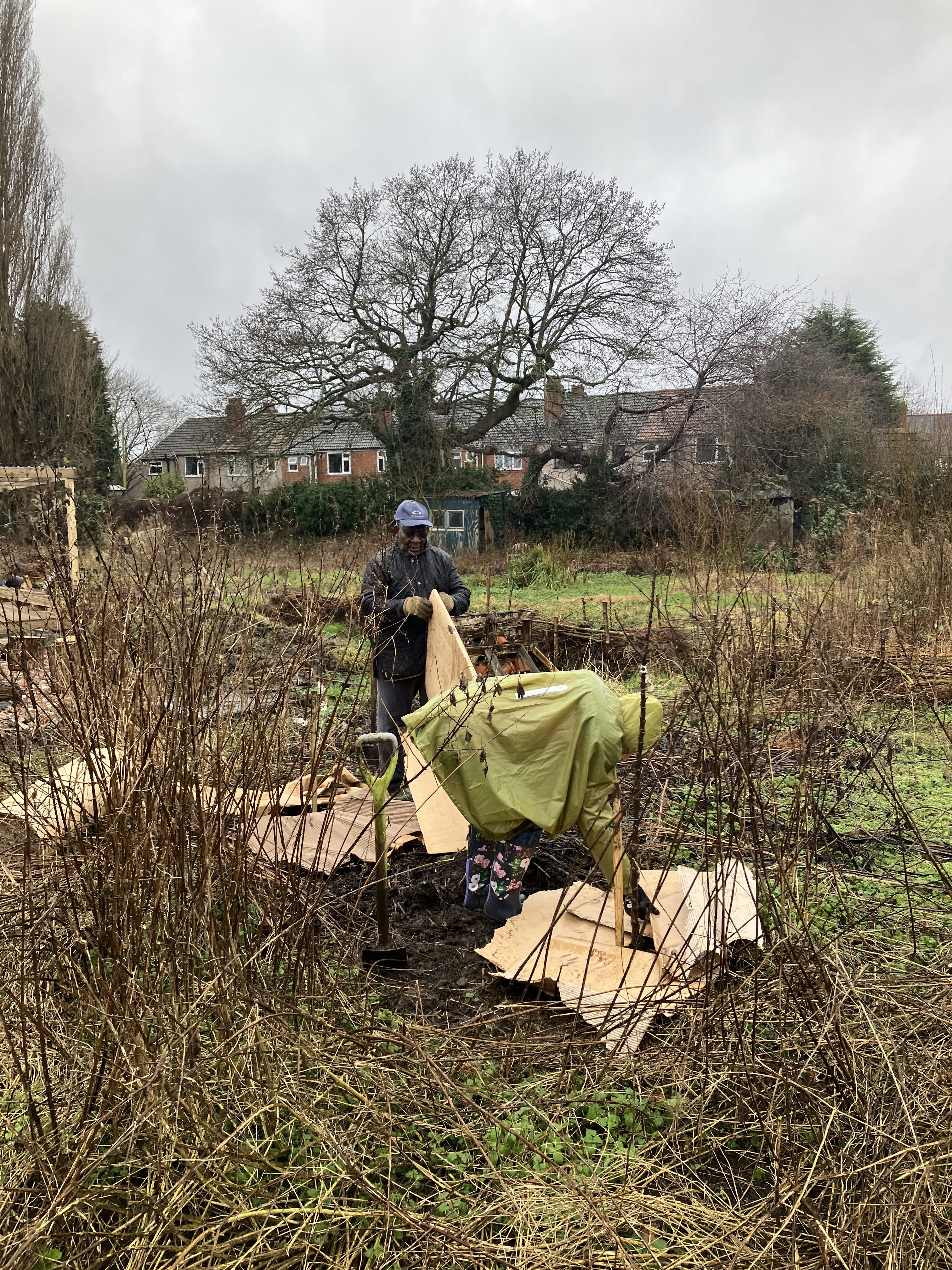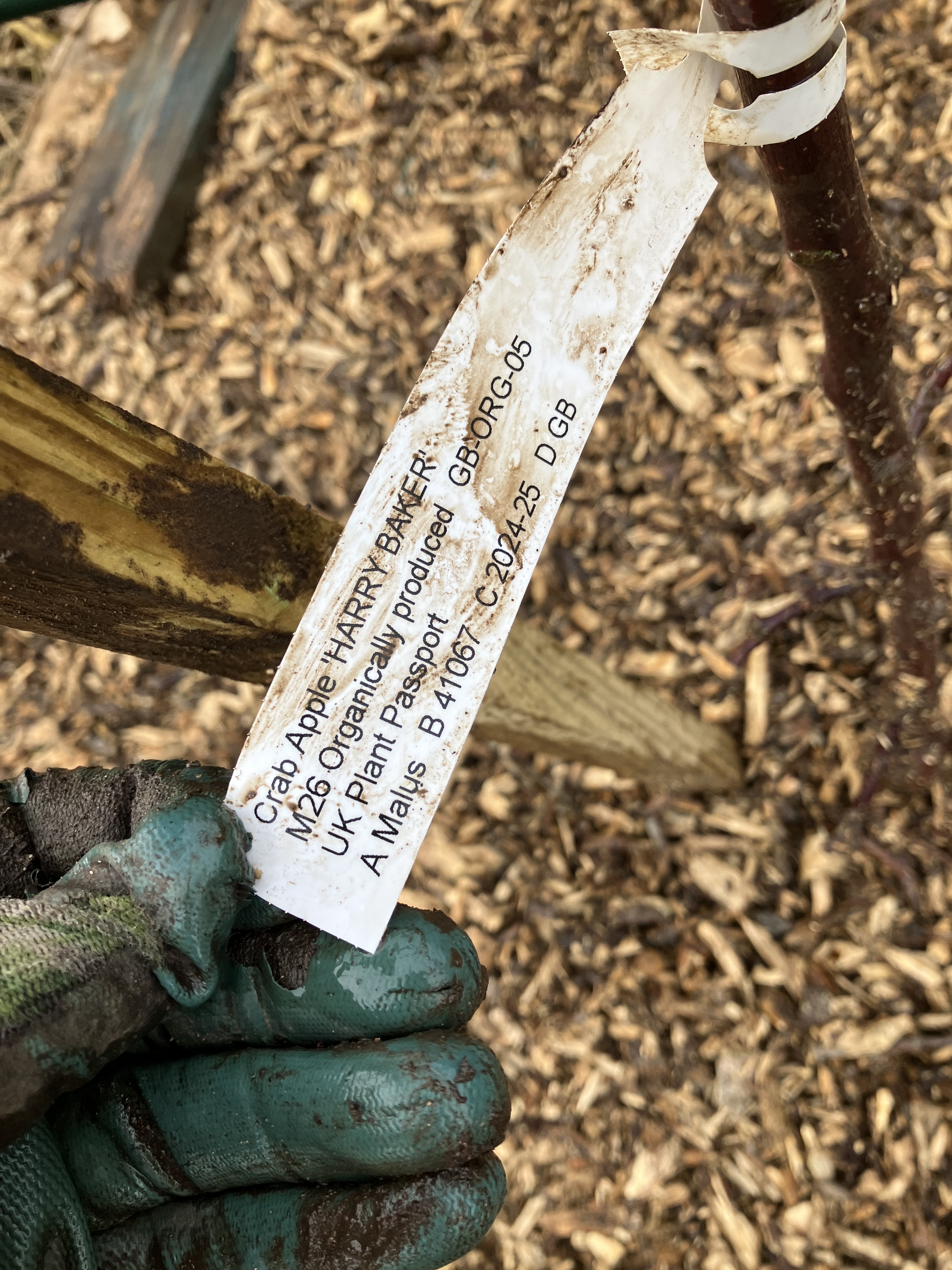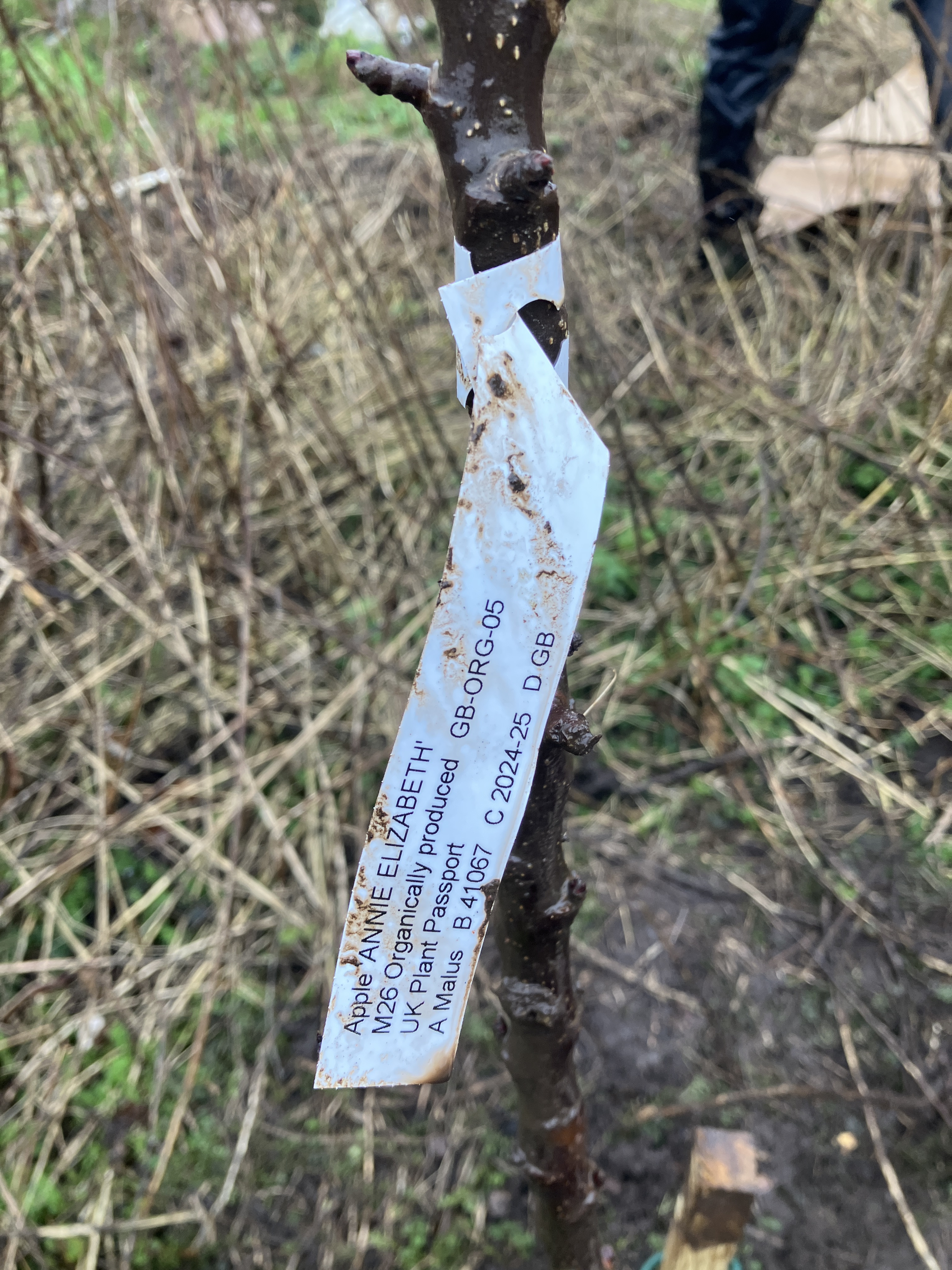 We planted the 3 apples and a crab apple tree in a little copse configuration, with a good layer of cardboard and woodchips to keep the weeds down around them. But time ran out and the weather carried on soaking us, so the gage and quince were also heeled in to a temporary home. Hopefully the weather will be a bit nicer for the next working party!