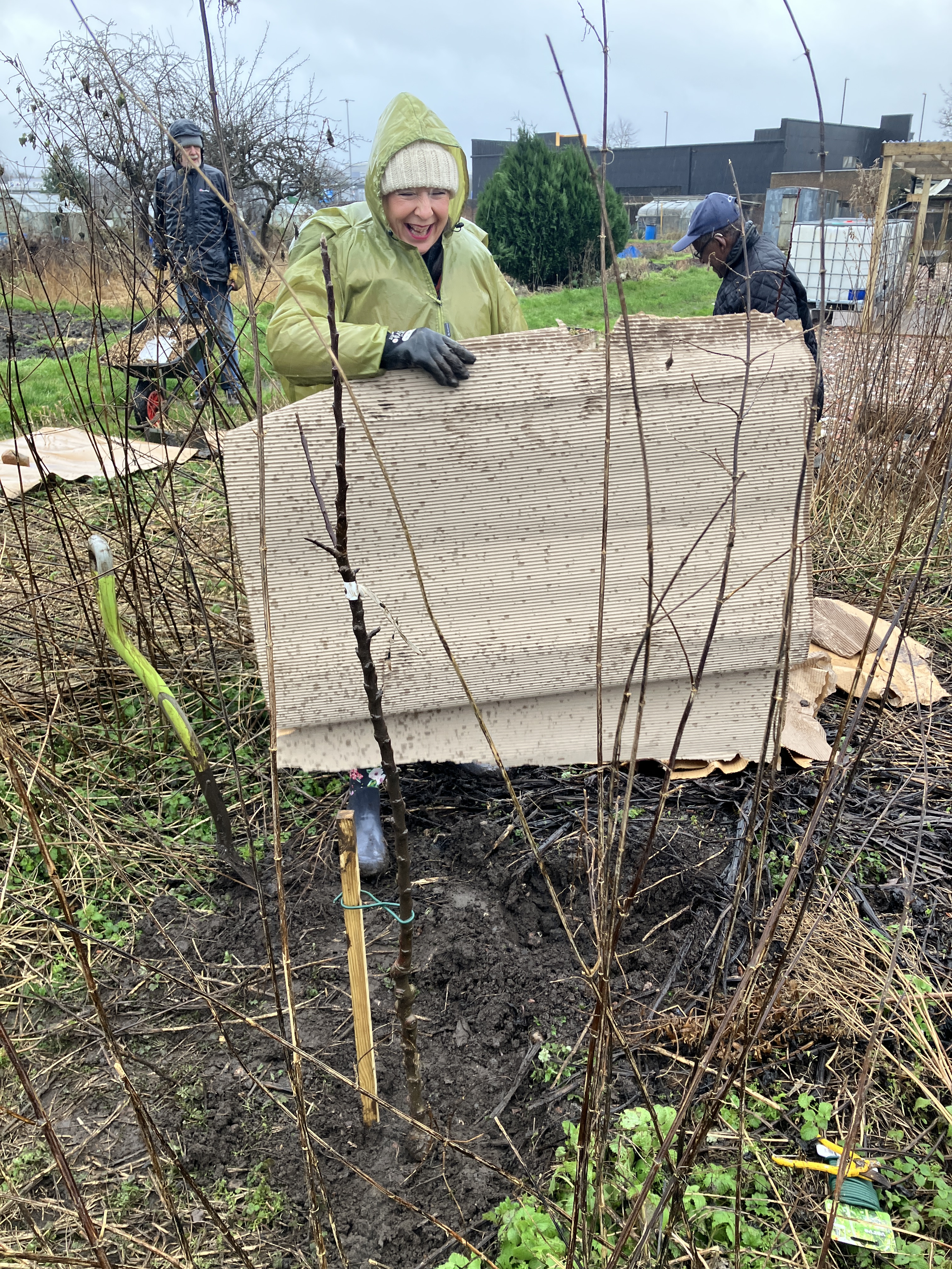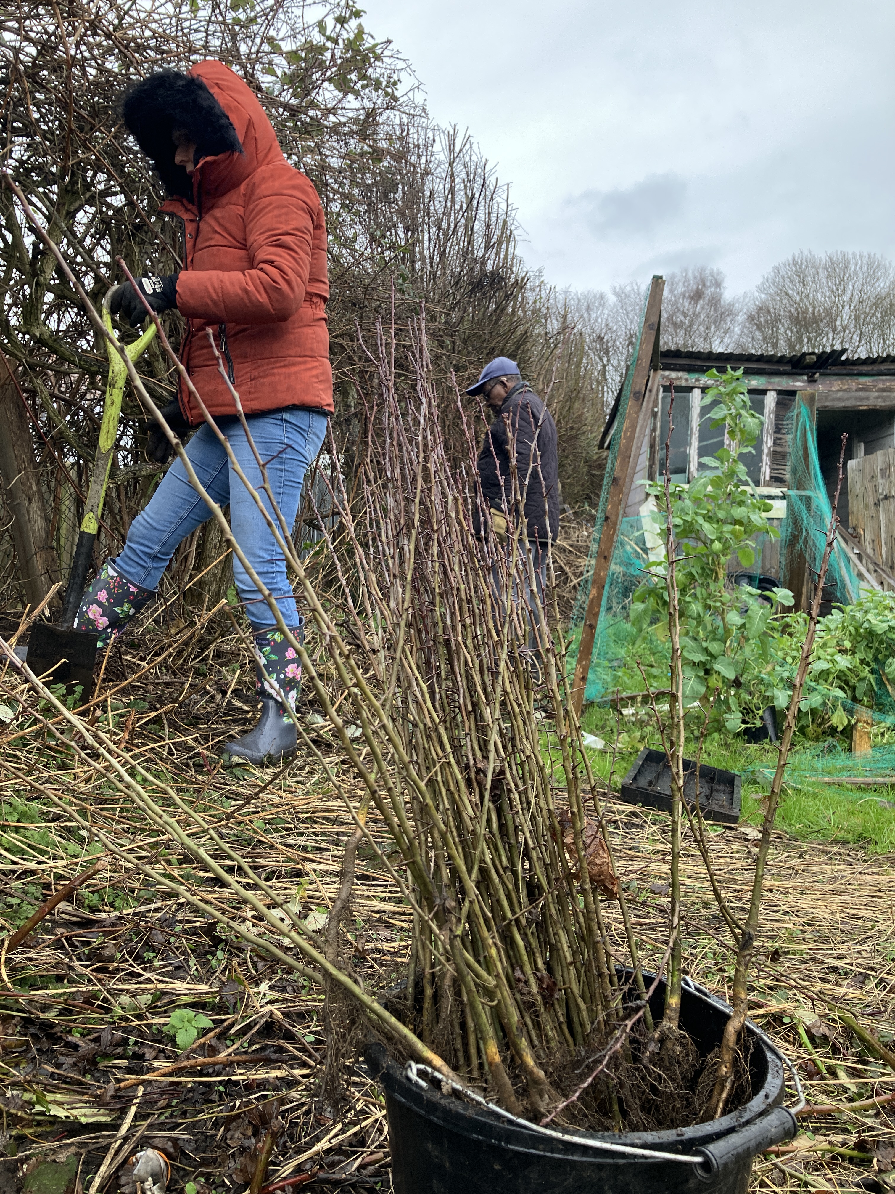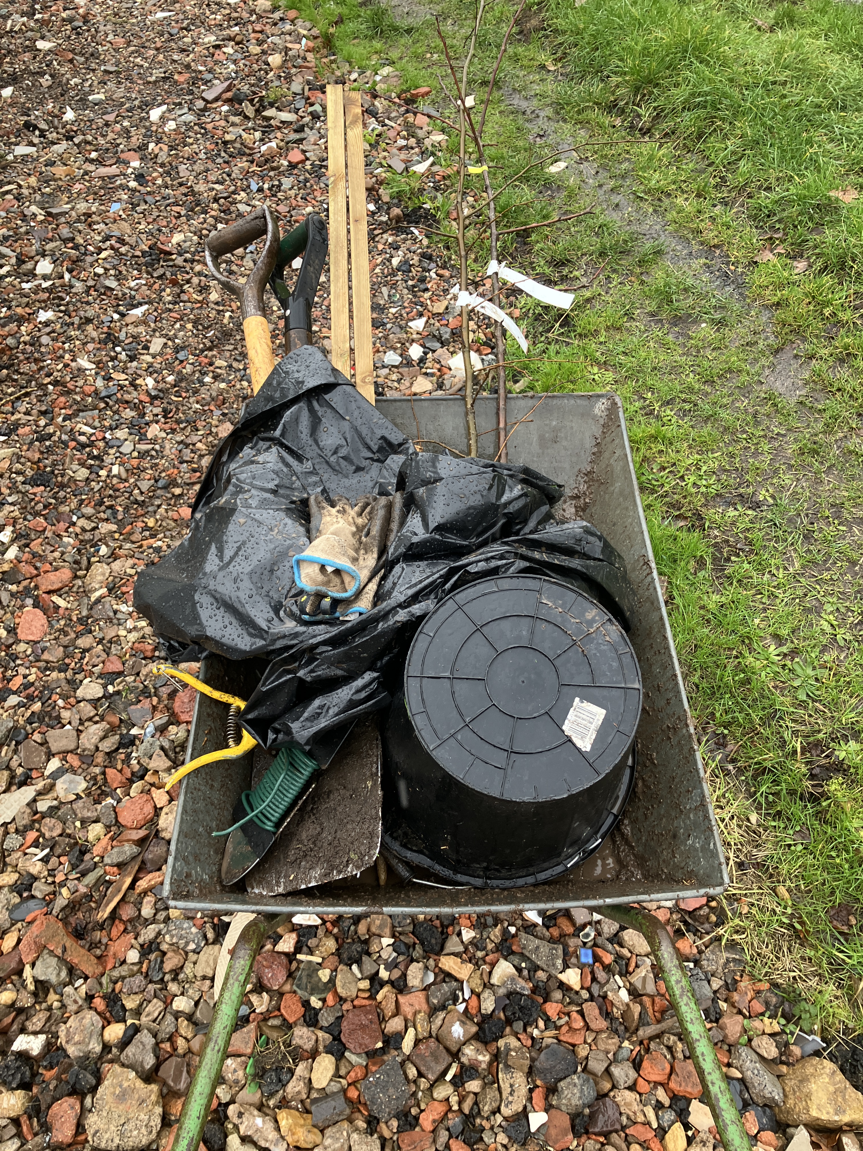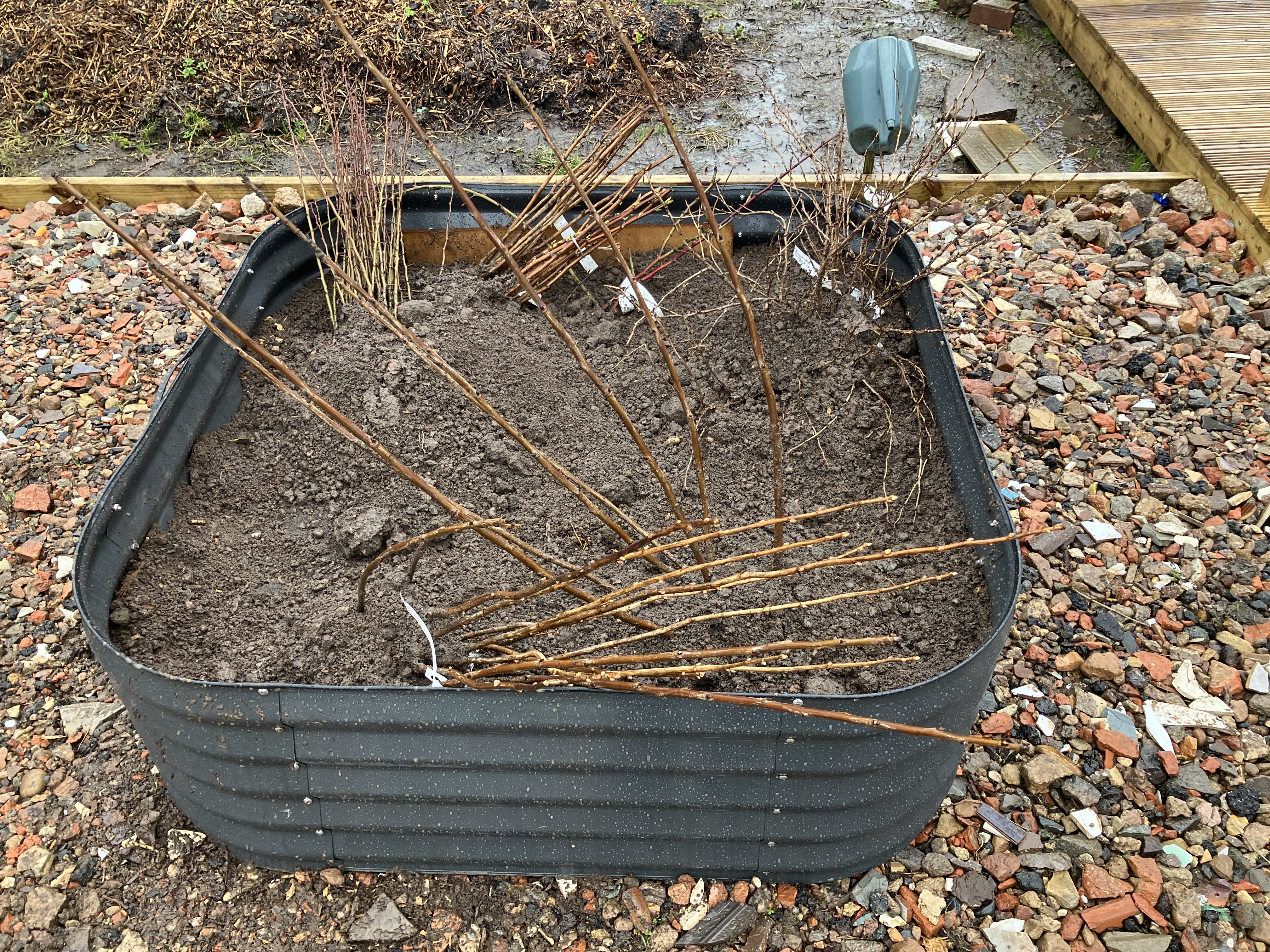 A pretty soggy working party today. We began by filling the gaps in the hedge with some hawthorn whips, and then – as the rain really set in and we all started to get very cold – we filled one of the raised beds to give us space to heel in the fruit bushes. We need to do some more ground preparation before we plant them in their final positions, so this will keep them safe until we’re ready to do that.