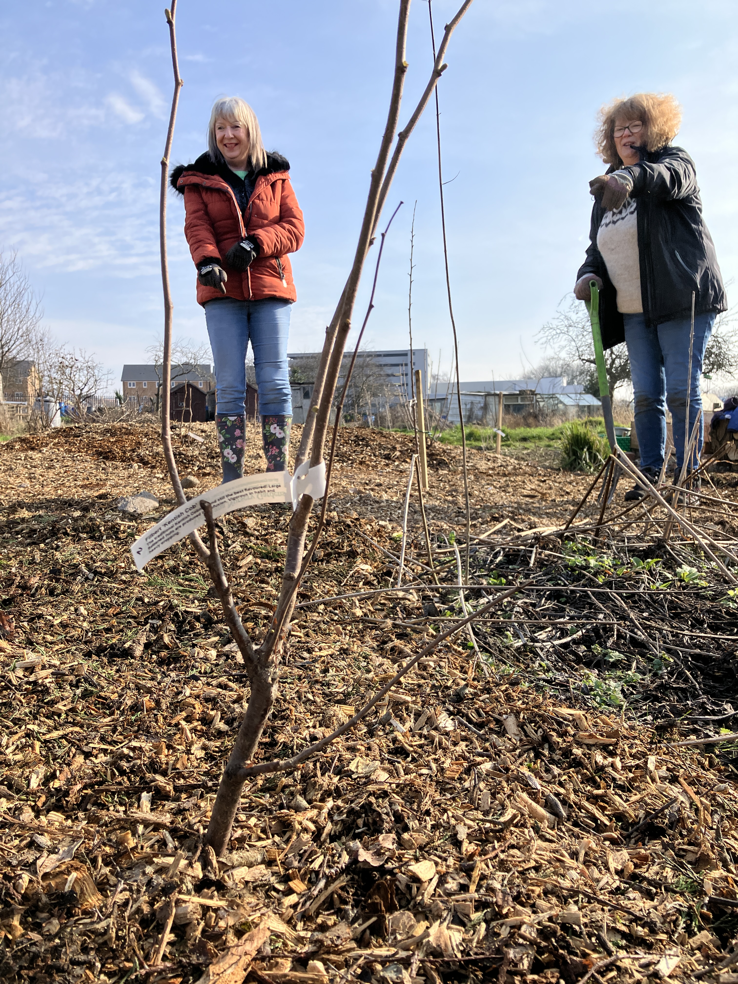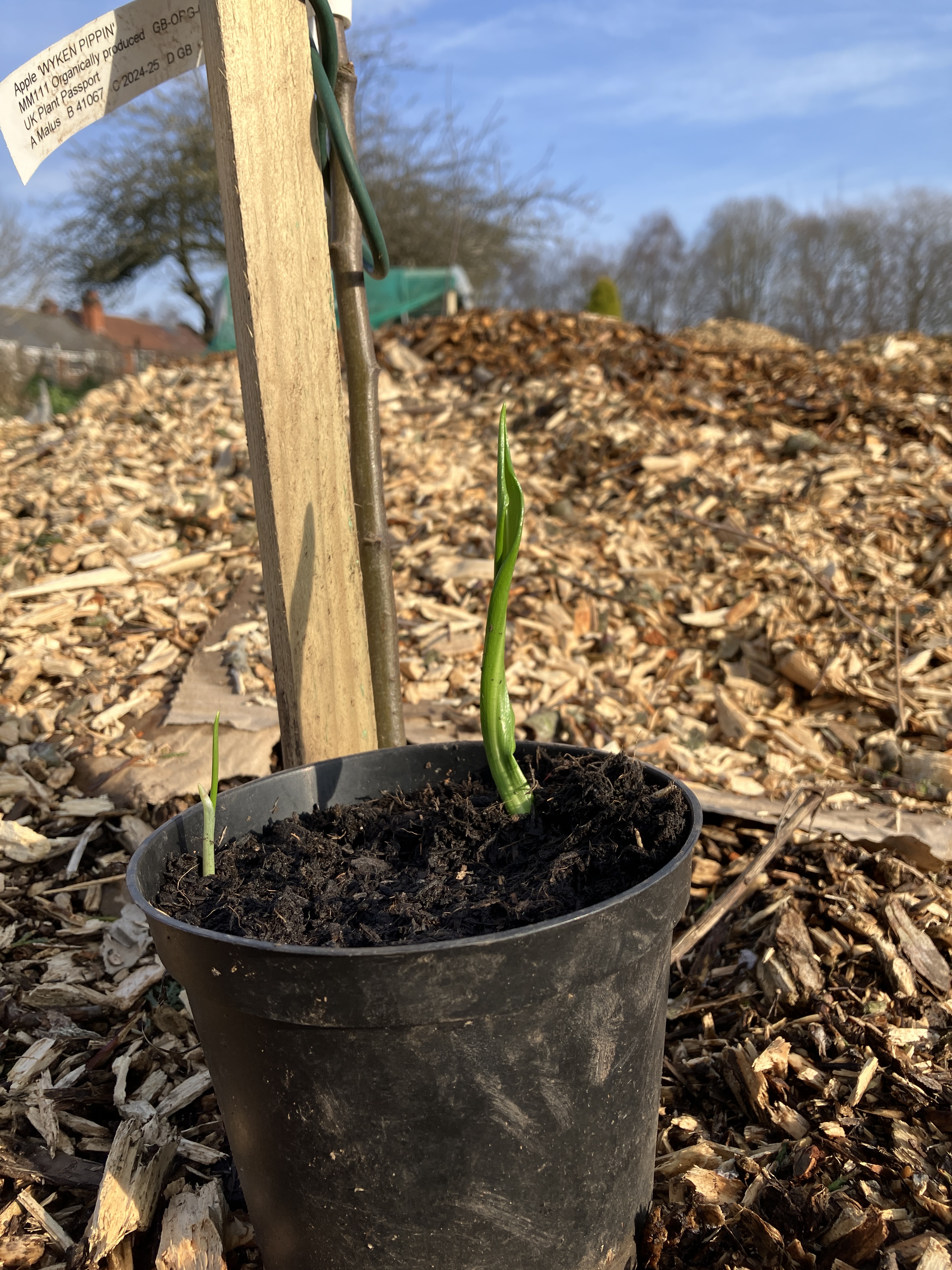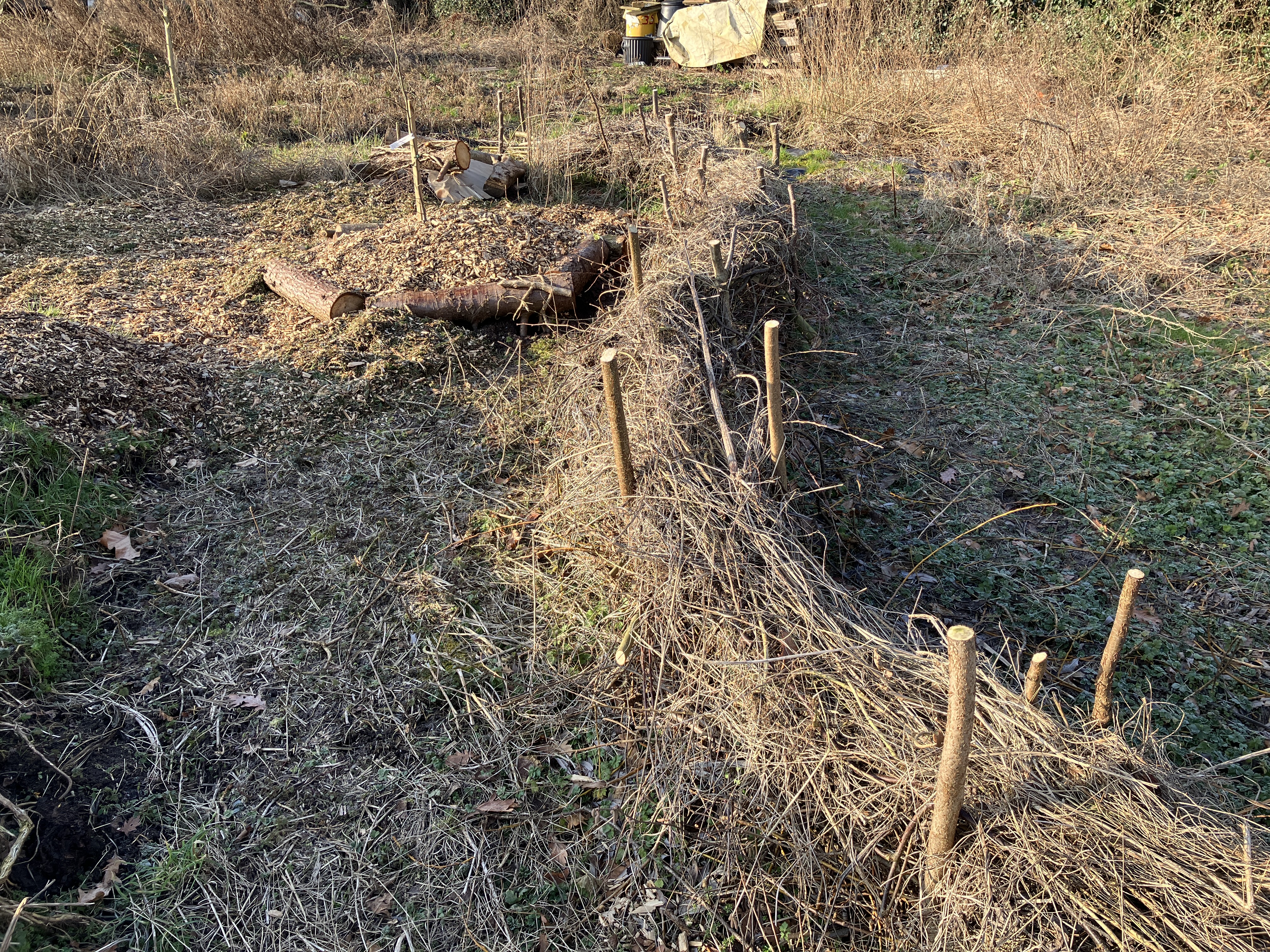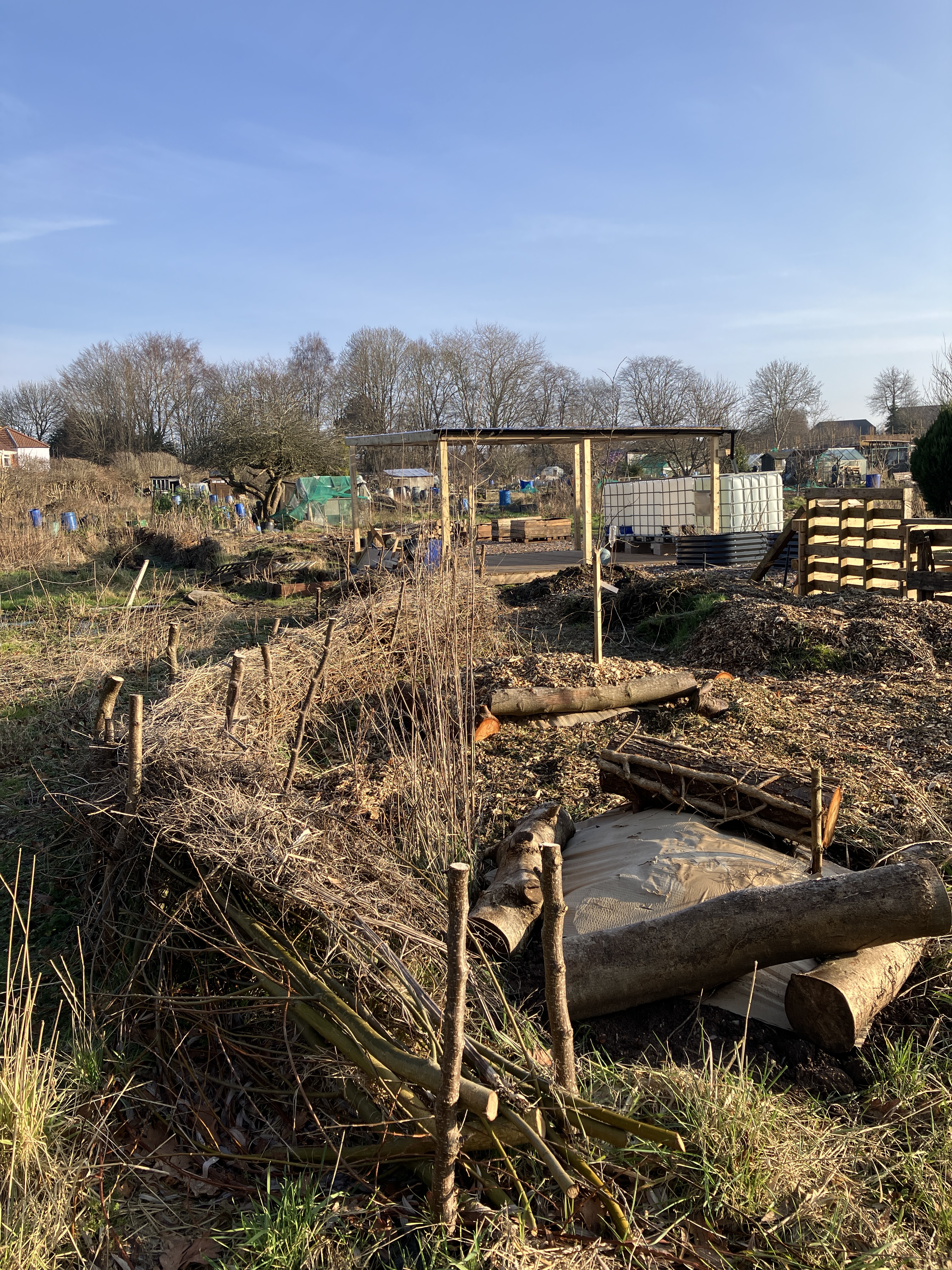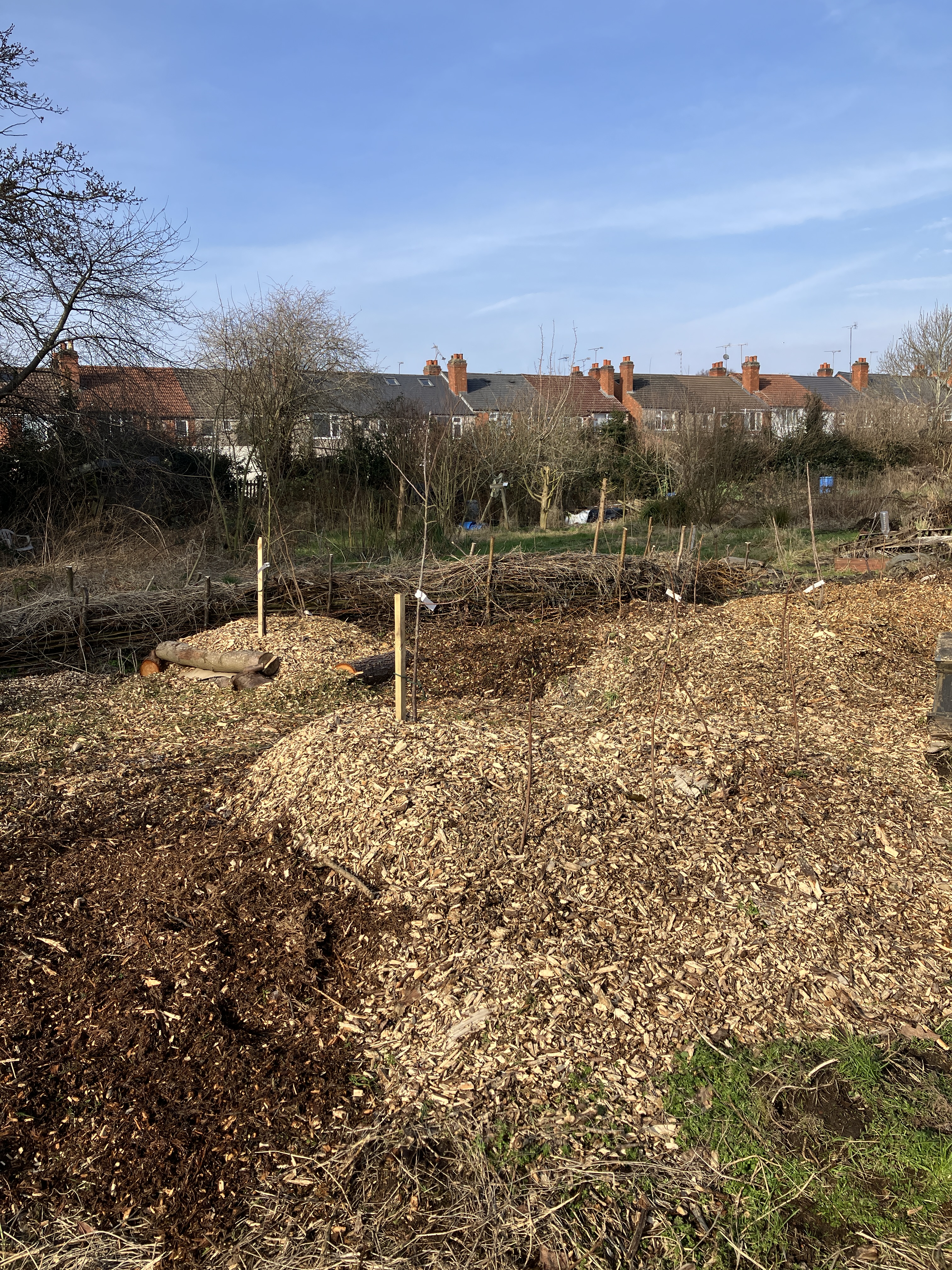 Our task for today was to get the remainder of the Food Forest planted up and crack on with putting the raised beds together. The highest part of the project site is where most of the forageable fruit will be. We planted thornless blackberry and some raspberry canes along the uphill edge of the plot; on the mound between the apple trees we planted the redcurrant, blackcurrant and gooseberries; we put wild garlic around the apple trees; and added some blackthorn and filberts (for sloes and nuts) in a little ‘thicket’ towards the dead hedge; and we also popped in a small clump of lemon verbena.
