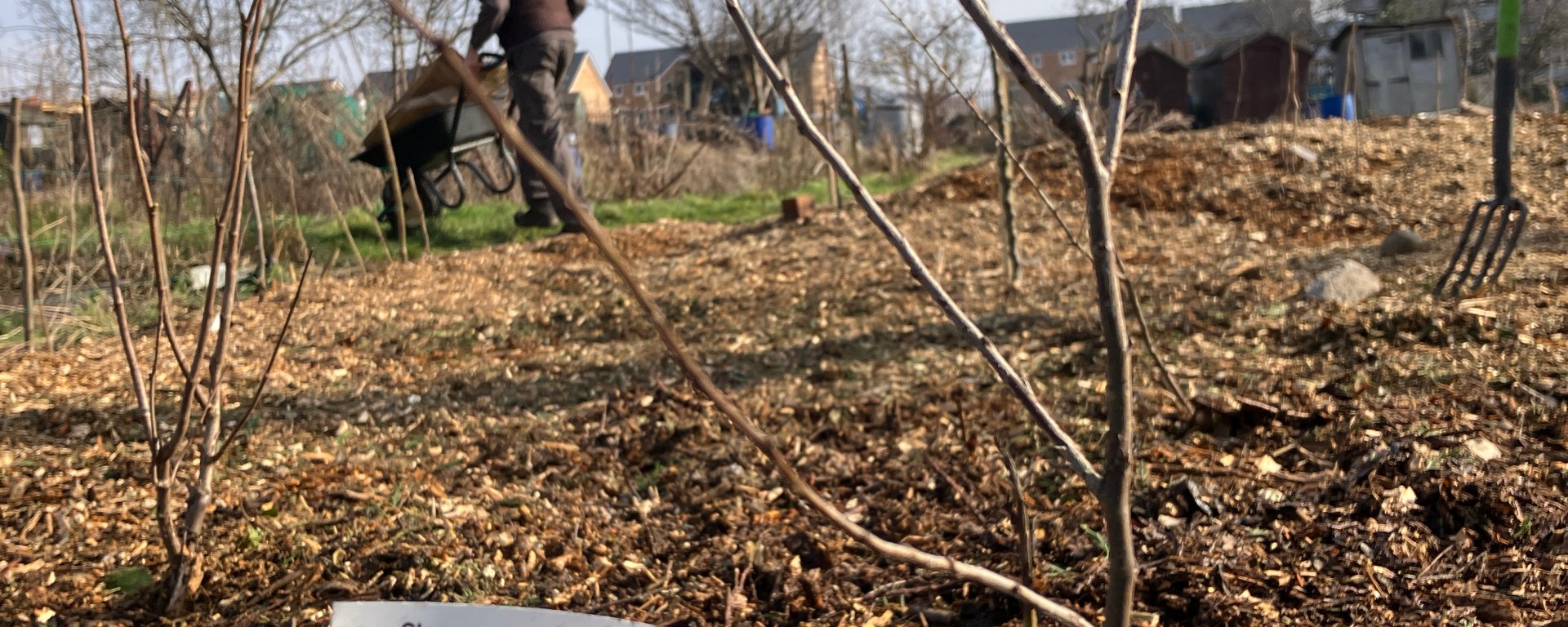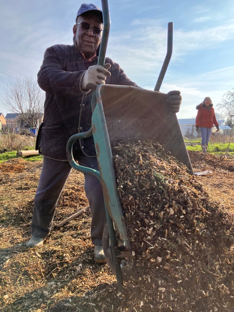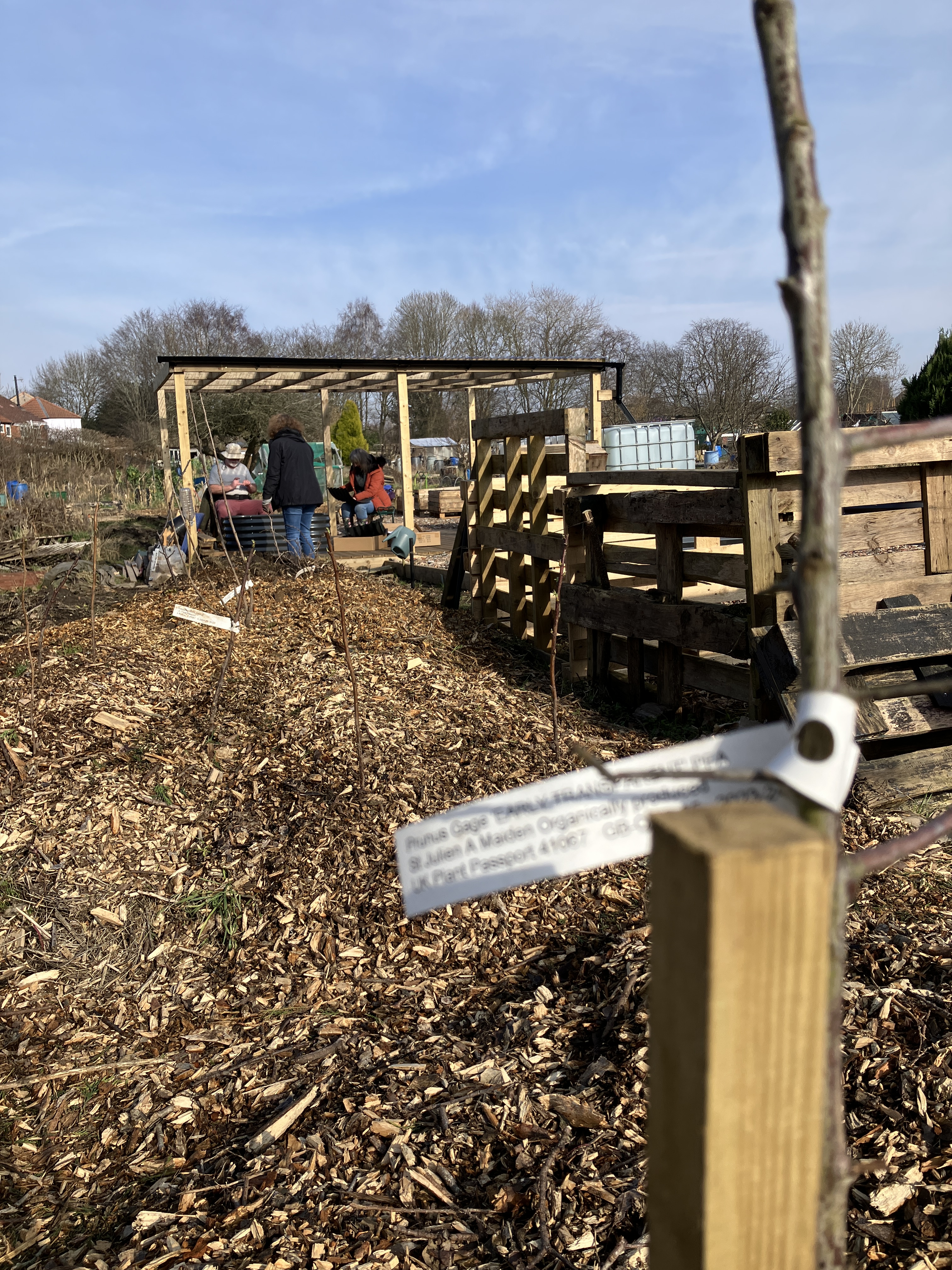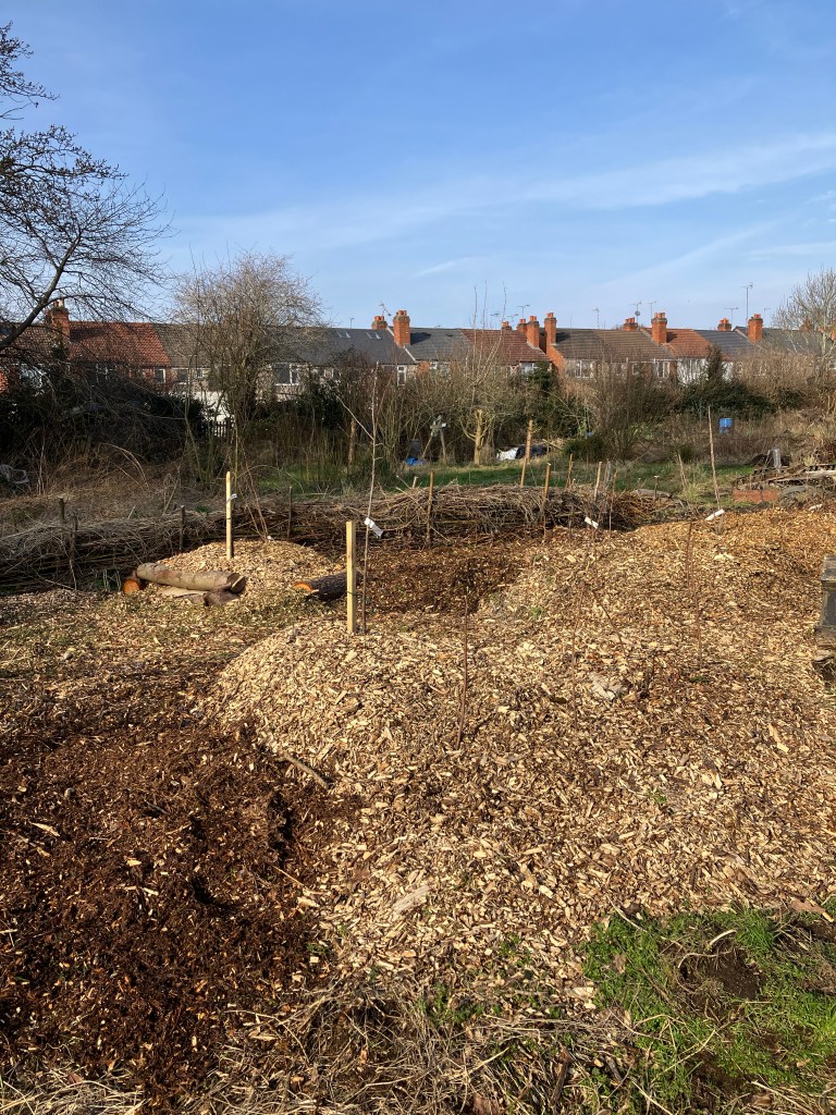 At the other end of the project site, we added some currants and raspberries to the mounds behind the compost bays. Then Dez and Mr Thompson wheeled barrowload after barrowload of woodchips to add to the layers of mulch – to surpress weeds and (in time) feed the soil.