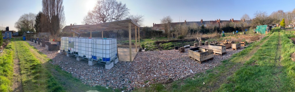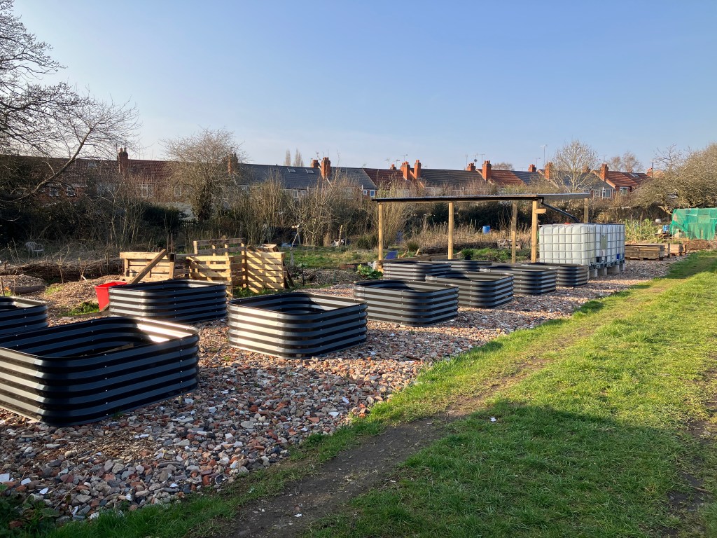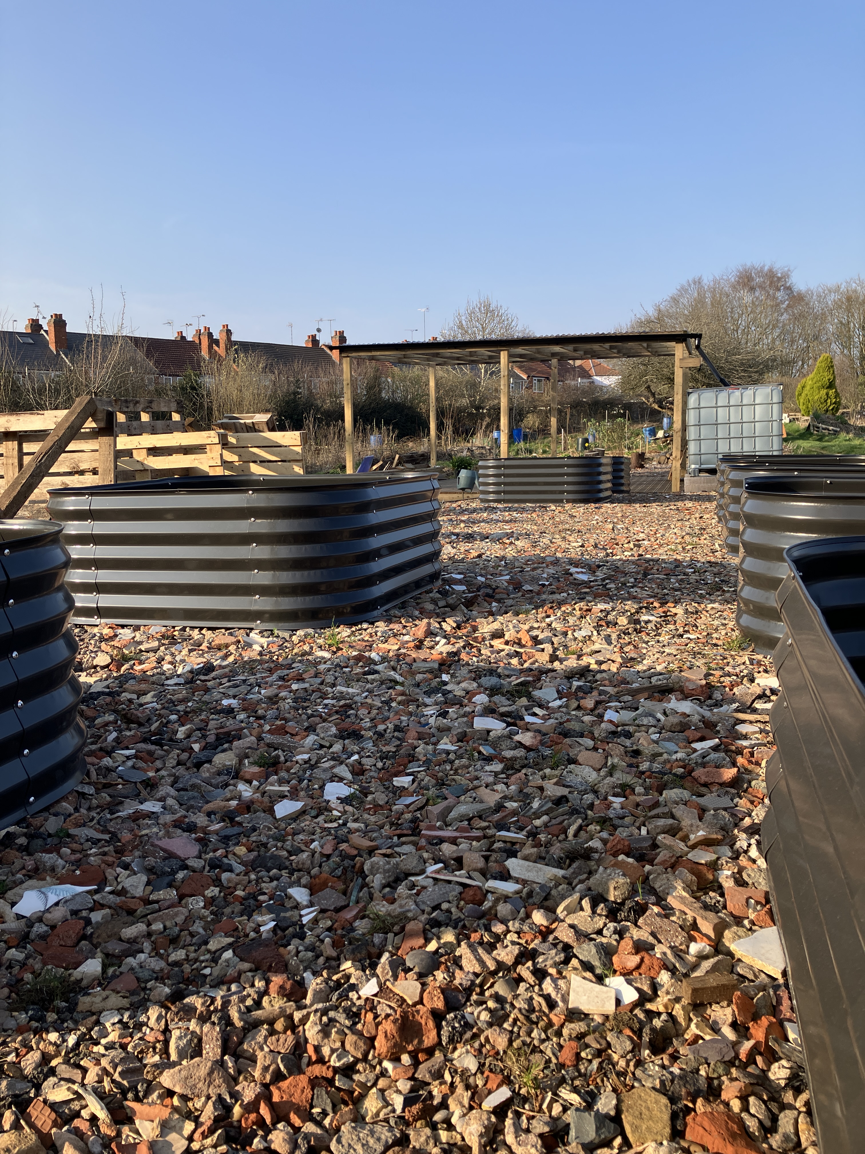 - Building a bank of rainwater-harvesting tanks that collect from the shelter roof to supply those renting the raised beds.