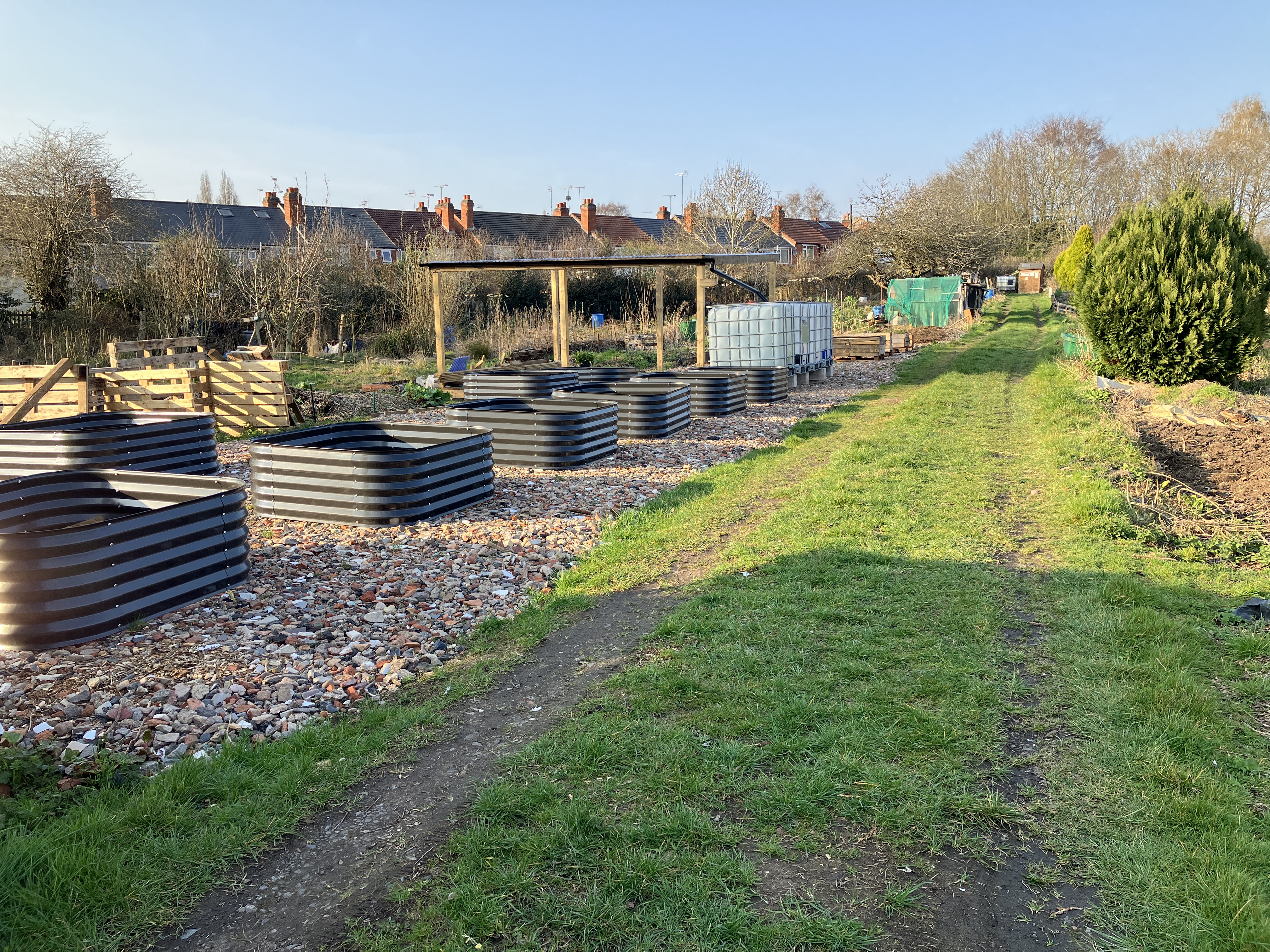 The Allotments Association successfully applied for funding from the West Midlands Combined Authority to transform a row of four waterlogged plots and future-proof our community food growing. These plots had become abandoned due to the extreme waterlogging and seasonal surface-water flooding connected to local building work and climate change.
