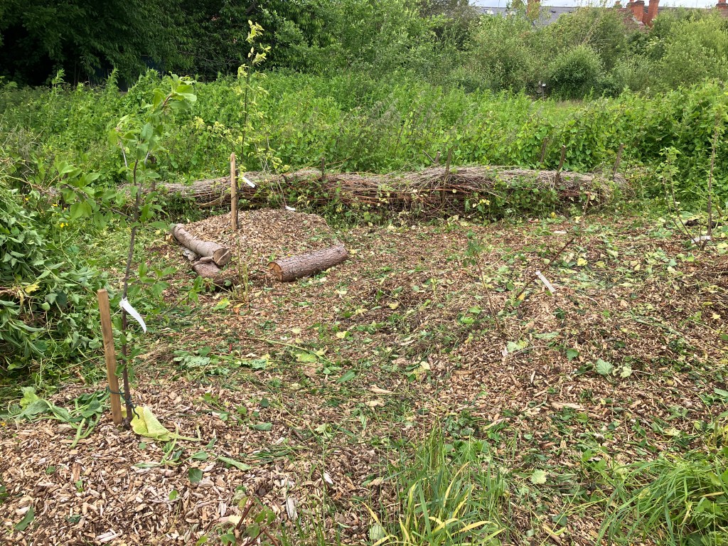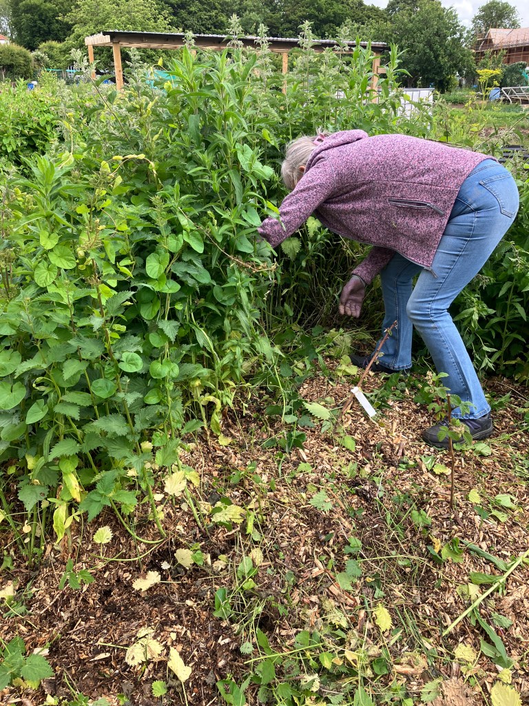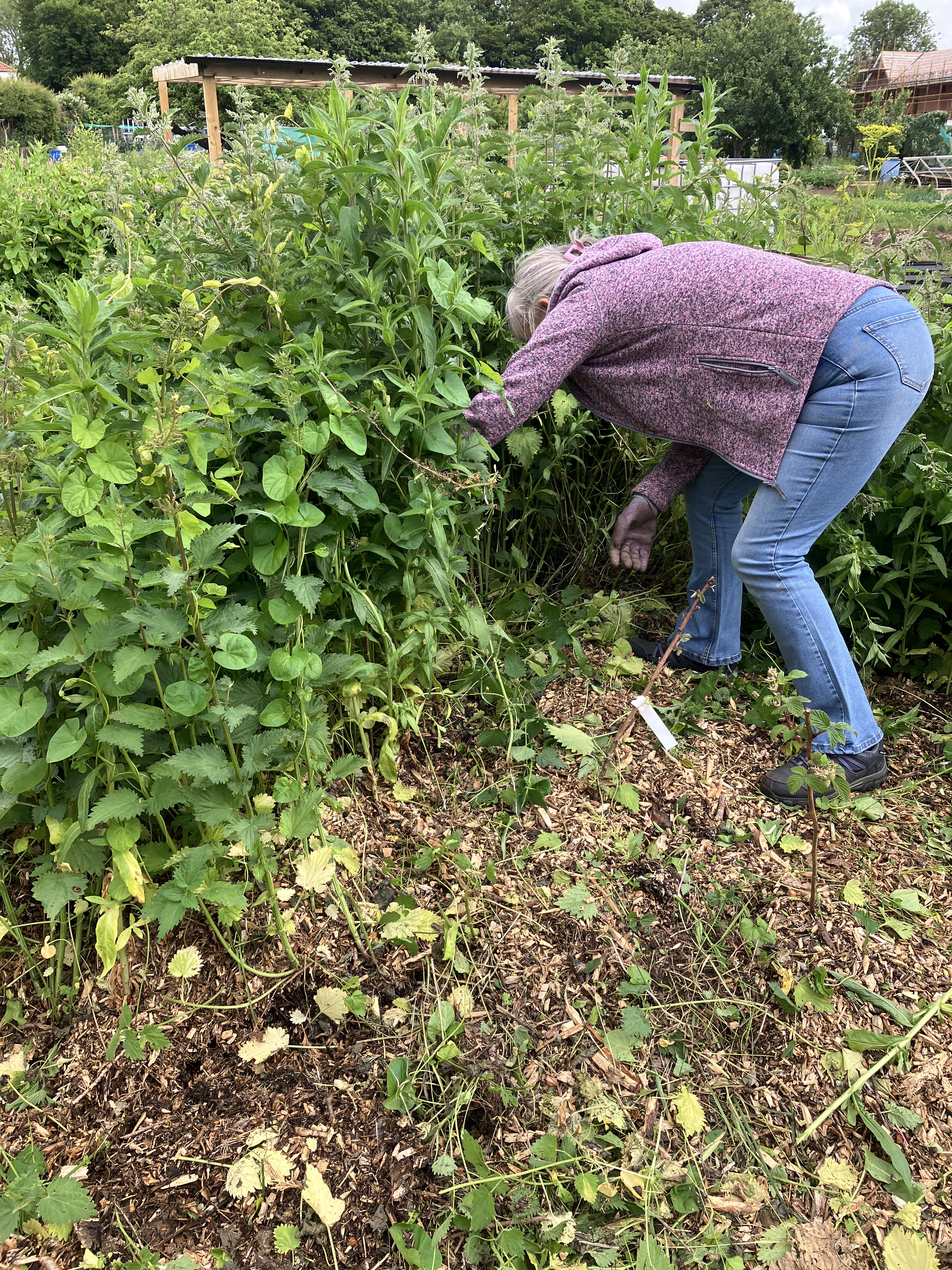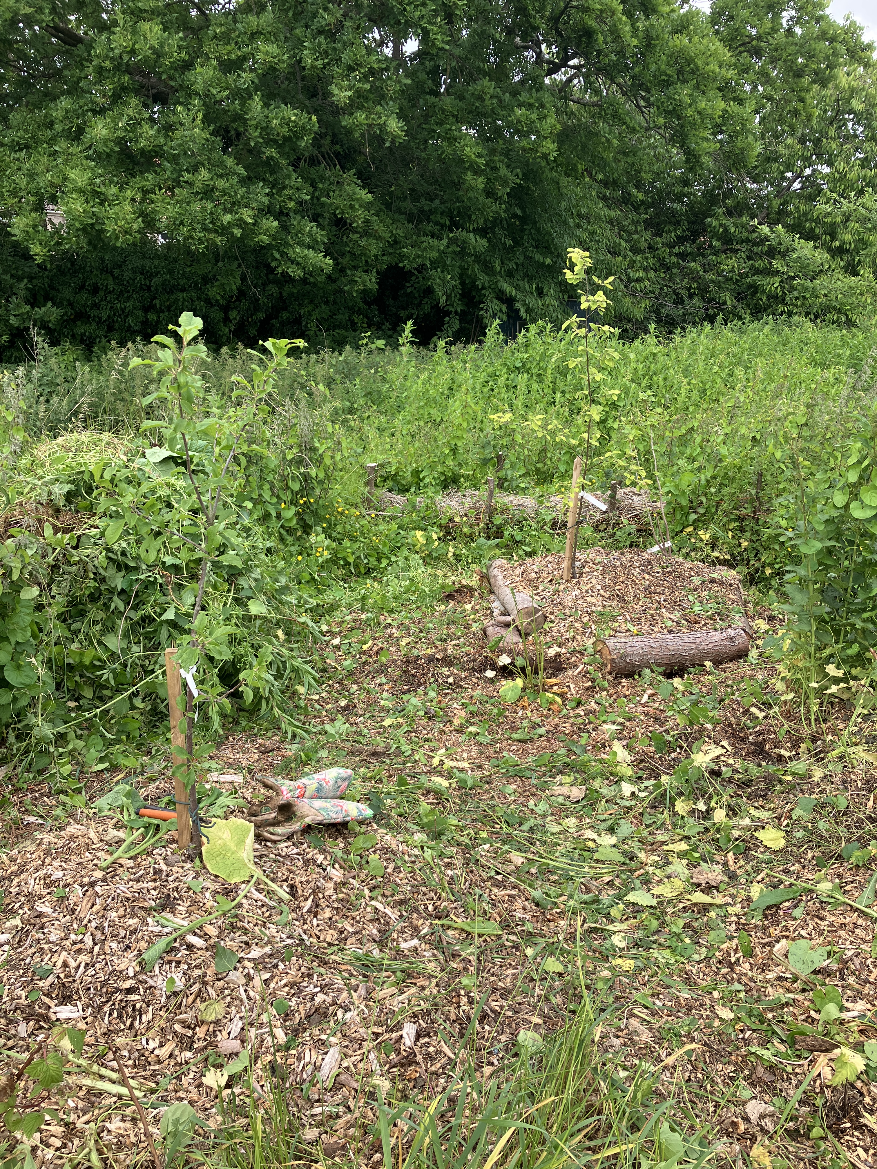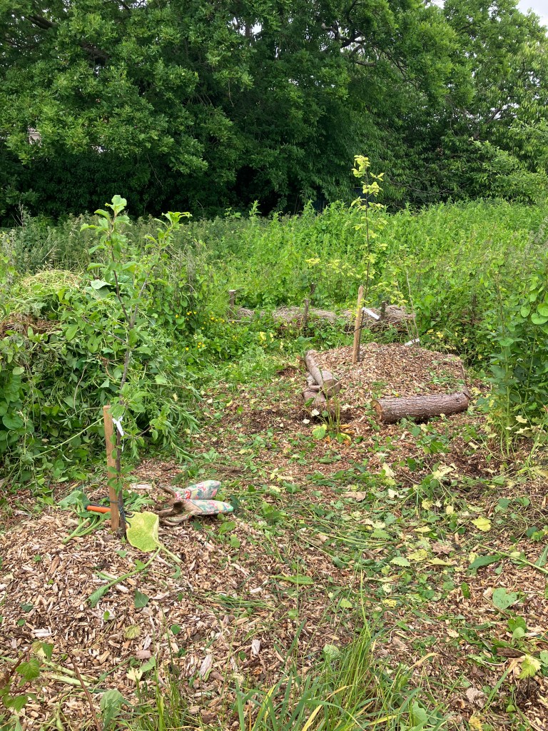 The sudden burst of wet weather following the very warm, dry spring has resulted in an explosion of nettles across the project plot, so today’s working party set out to pull those up and give the fruit trees and bushes of the mini-food-forest a bit more breathing space.