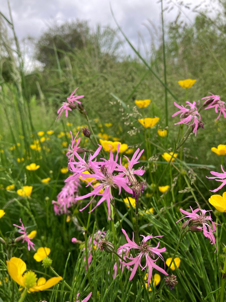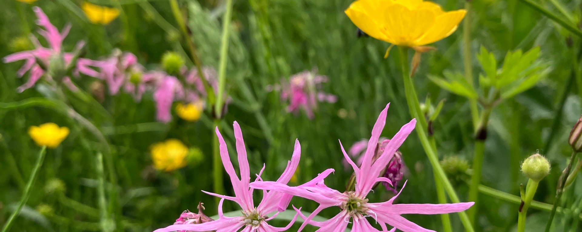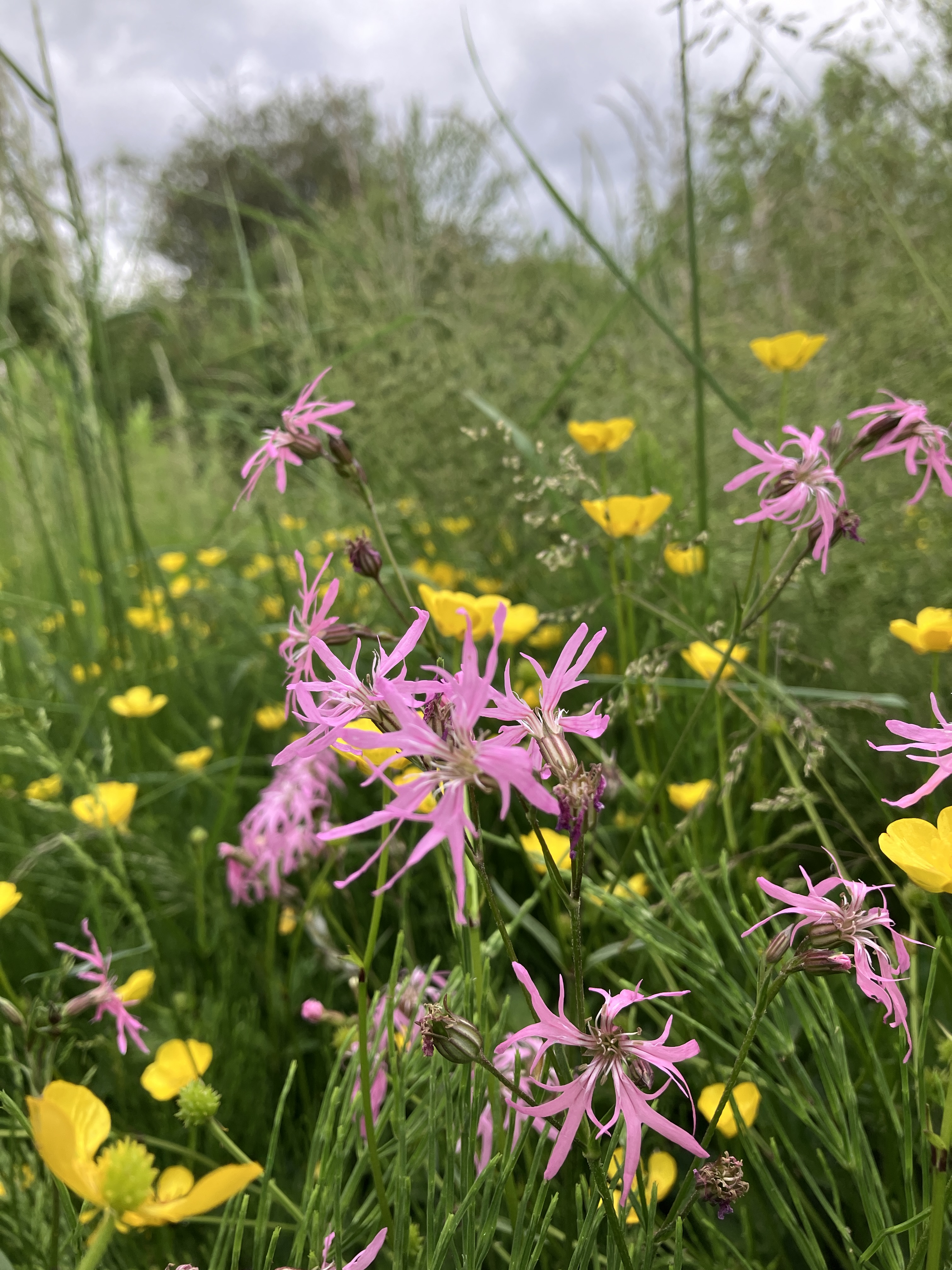 In the wetland area, it’s going to be a case of incremental management – thinning growth where one species is in danger of taking over. We took out a few of the willowherb plants as they are really soaring at the moment, helping give a bit more space to the Ragged Robin, one of the wetland plants that we put in earlier this year – and which is now flowering and looking beautiful amongst the buttercups and flowering grasses.