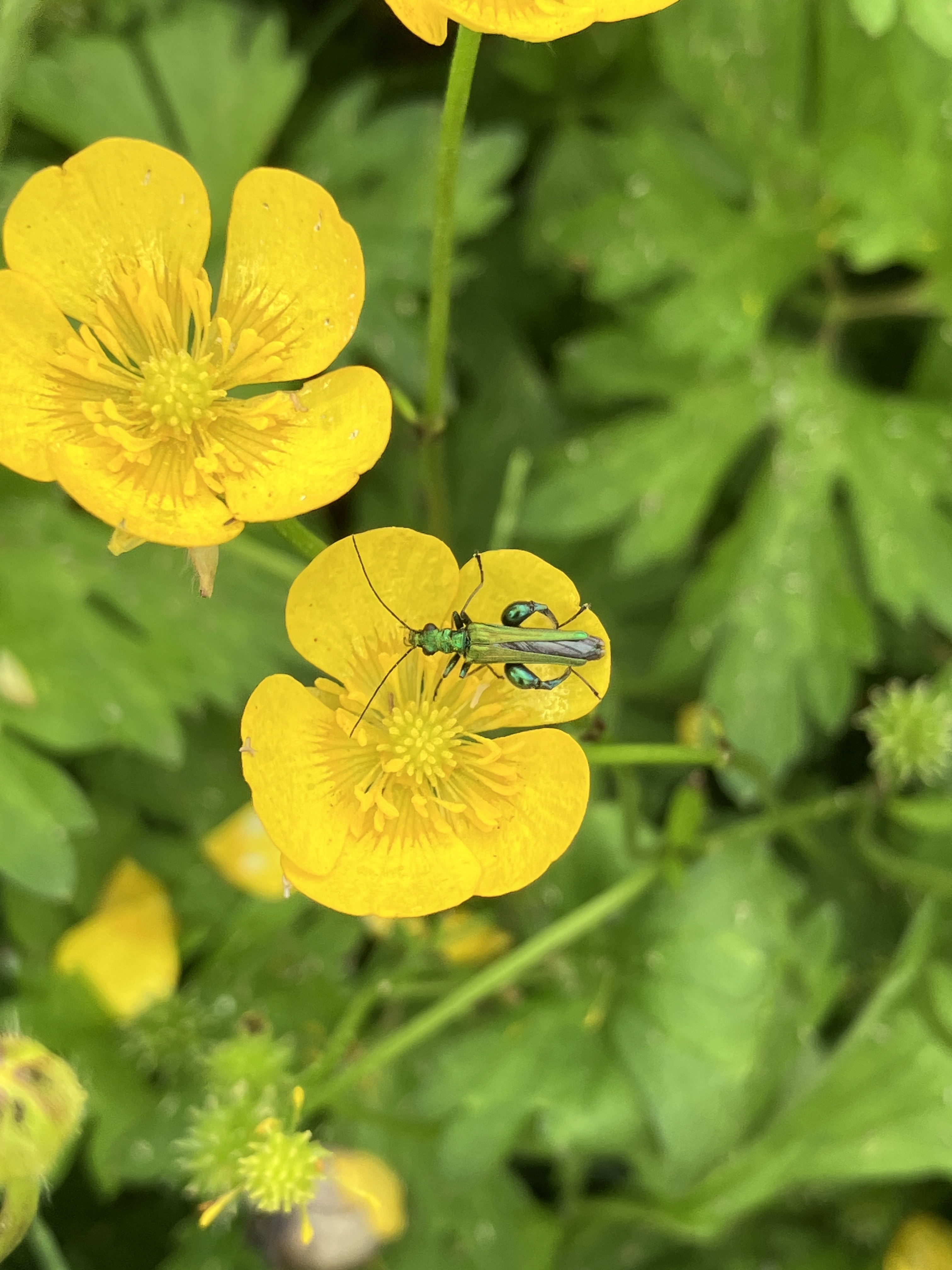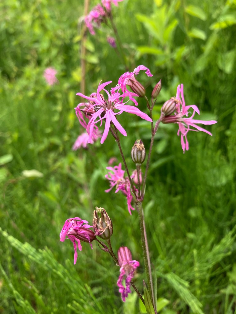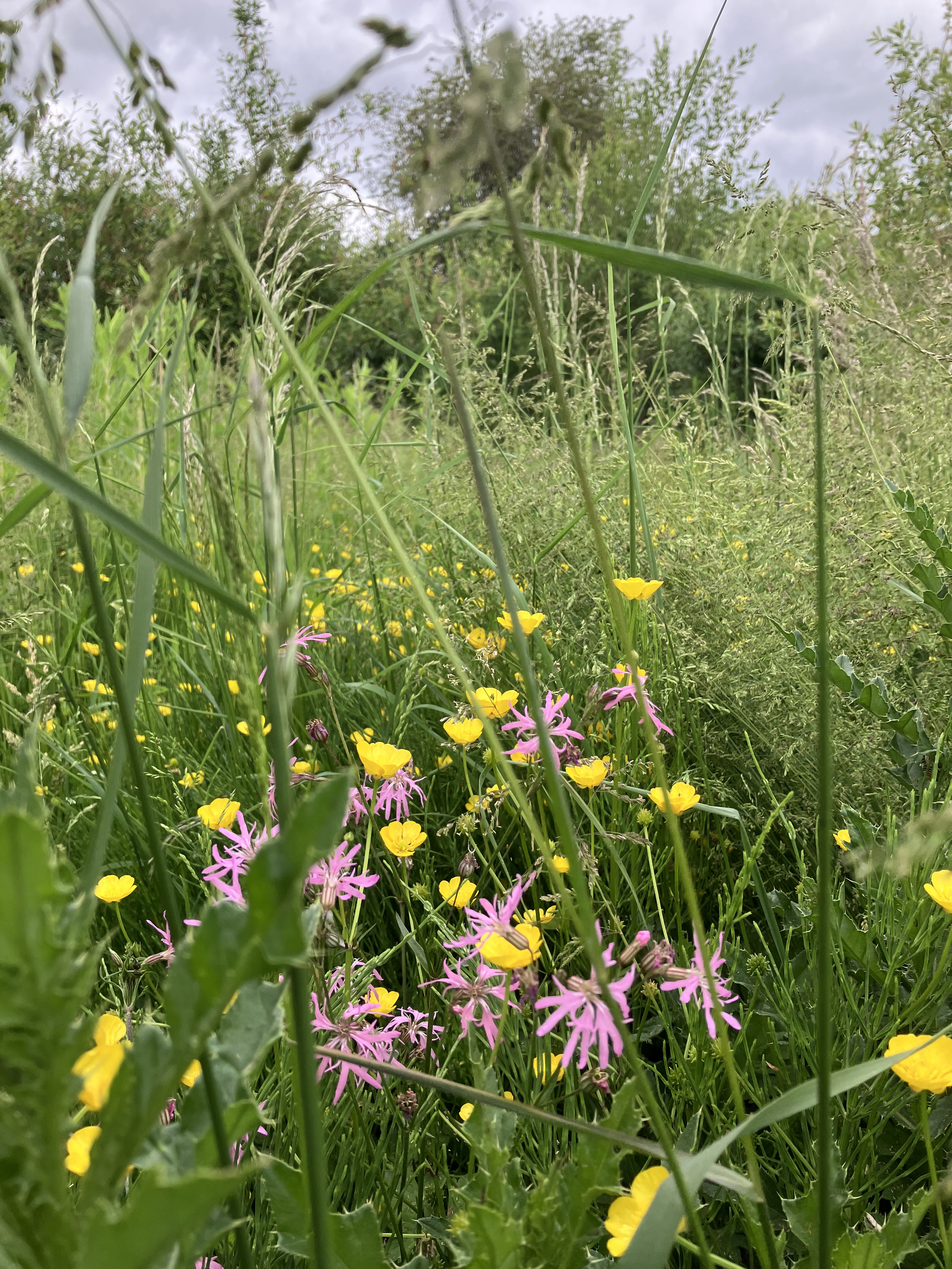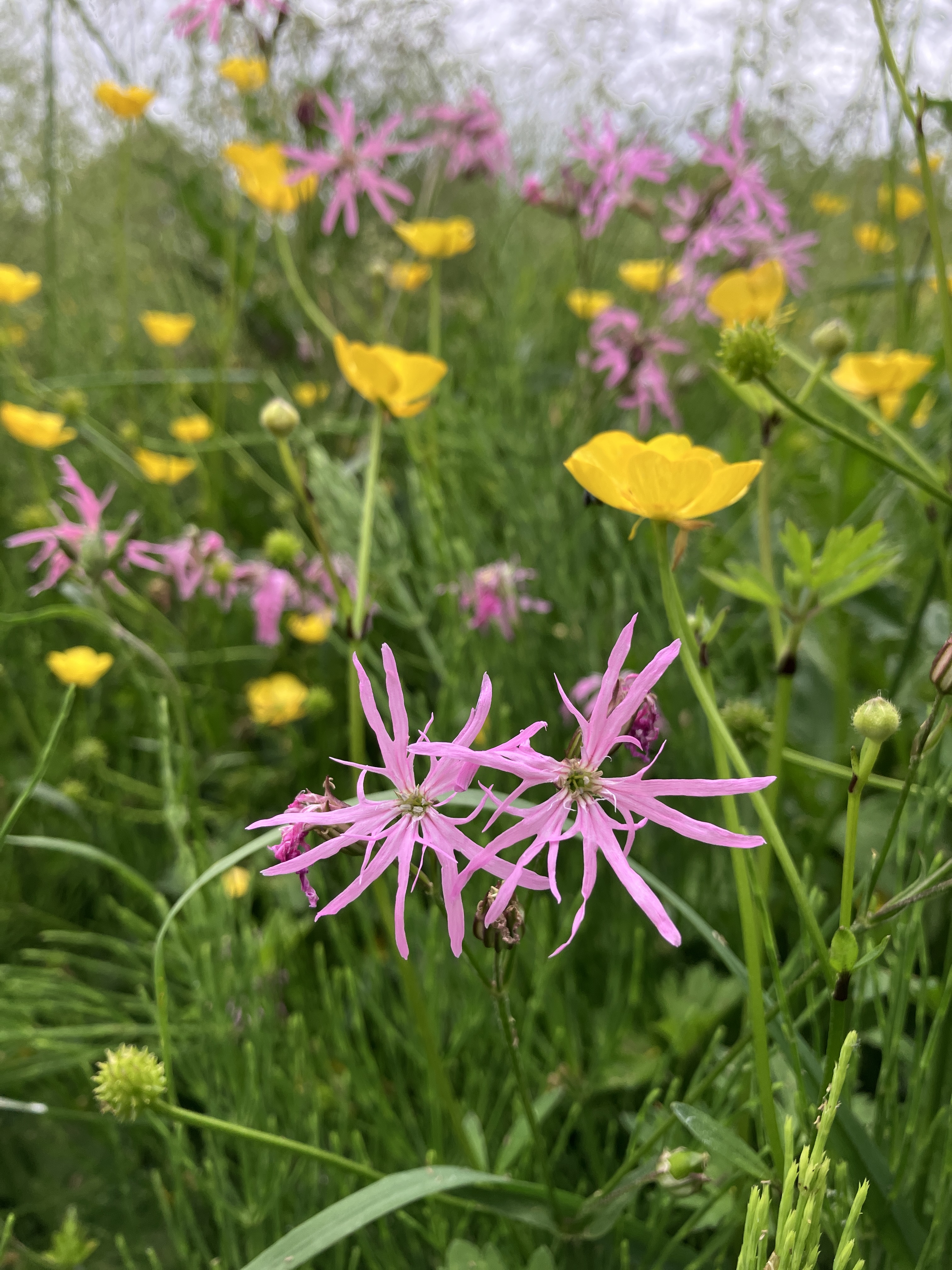 In the wetland area, it’s going to be a case of incremental management – thinning growth where one species is in danger of taking over. We took out a few of the willowherb plants as they are really soaring at the moment, helping give a bit more space to the Ragged Robin, one of the wetland plants that we put in earlier this year – and which is now flowering and looking beautiful amongst the buttercups and flowering grasses.