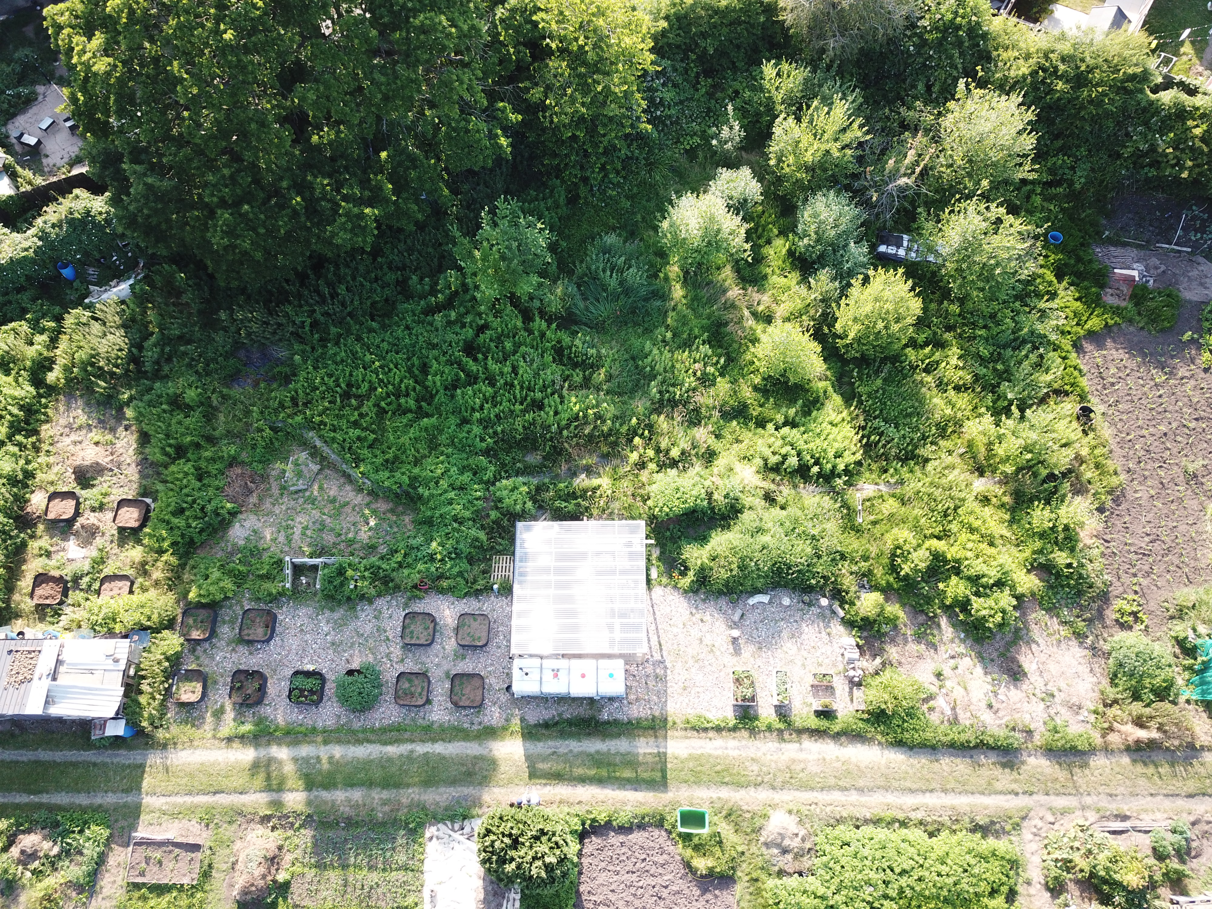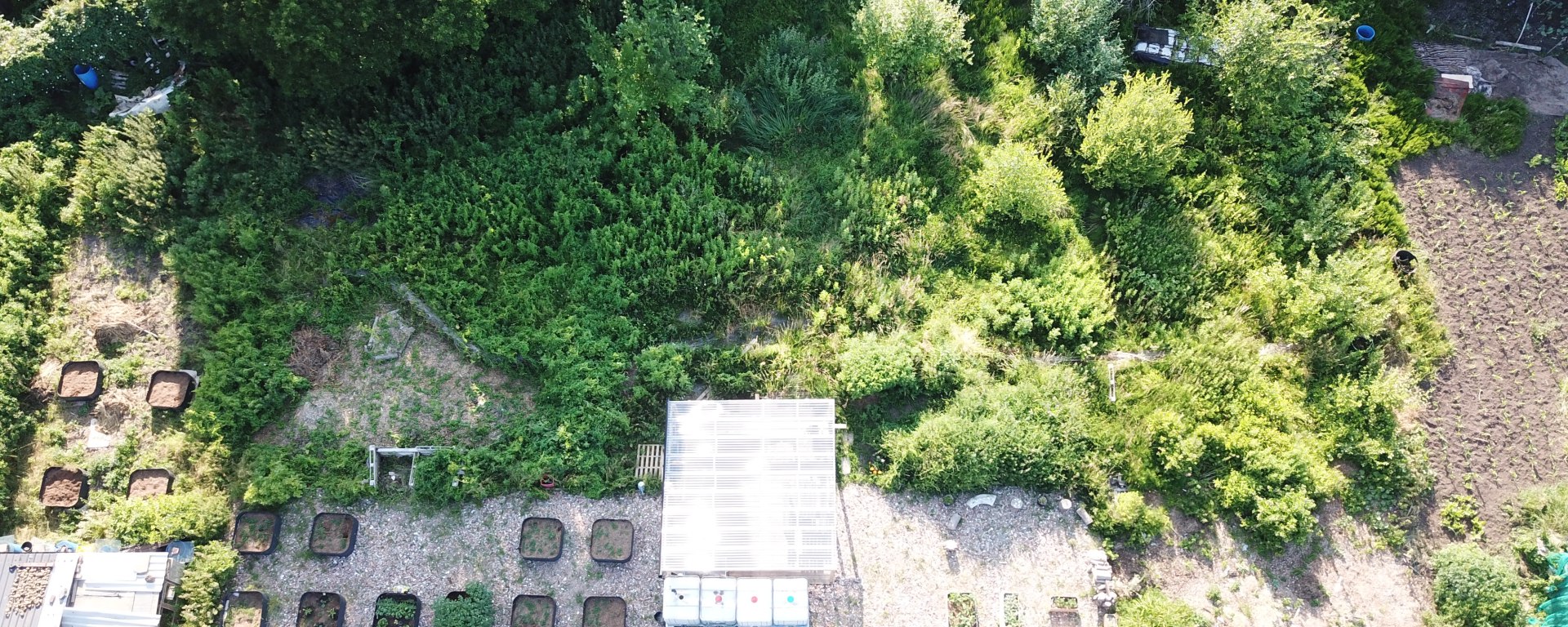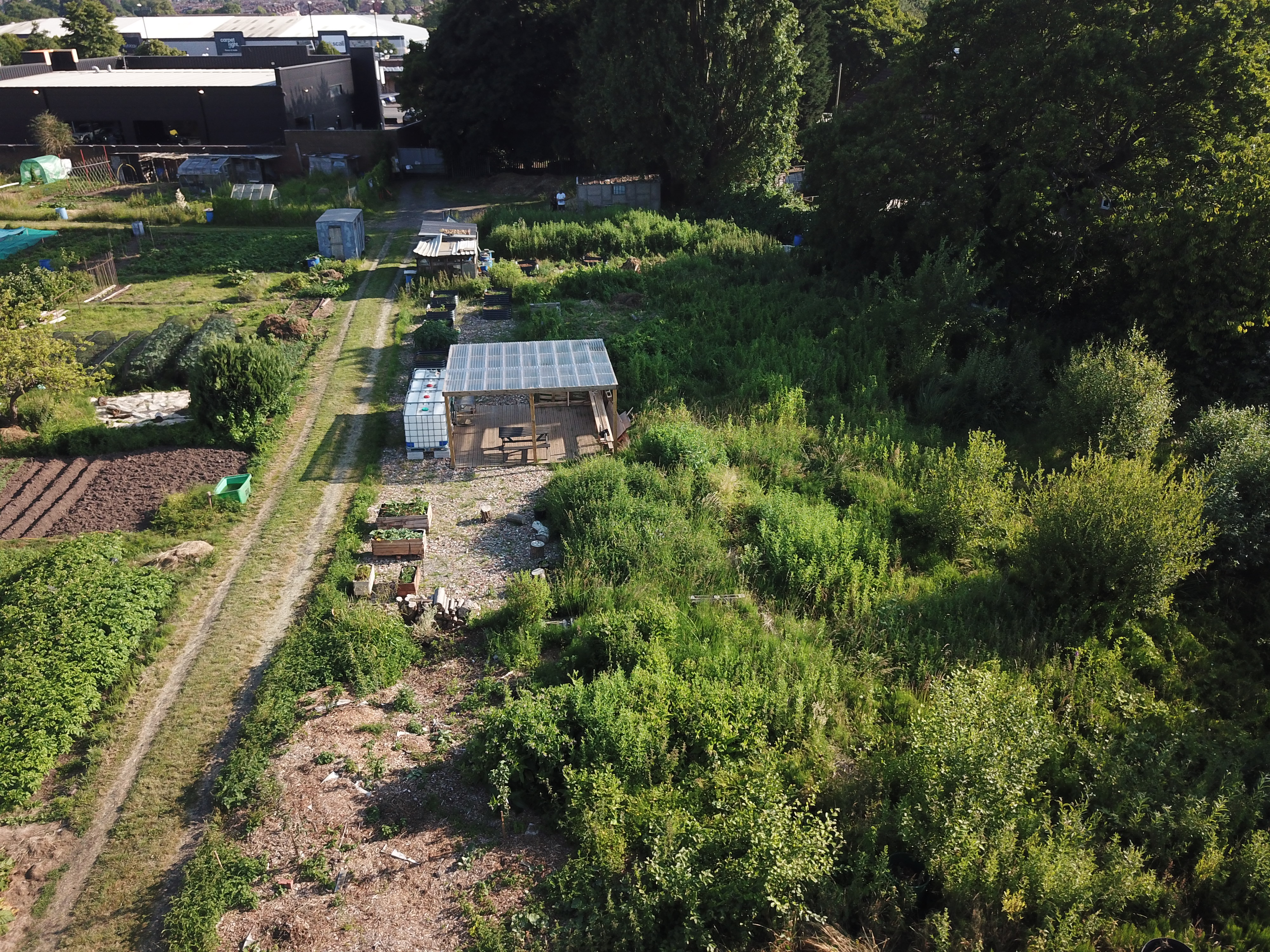 Here we are looking across the main access path (double lines towards the bottom of the image) and above that the hard-standing with shared learning/social space (pergola) in the centre. The four rainwater collection tanks can be seen between the shelter and the path, and the raised beds on either side. The mini food forest areas are the more open areas (because the trees are still saplings) towards the bottom right of the image, and the triangular cleared section towards the centre left – the top edge of this triangle is one of the dead hedges. The top half of the image shows the nature reserve, with the young wet willow woodland on the right and the ancient oak canopy top left.