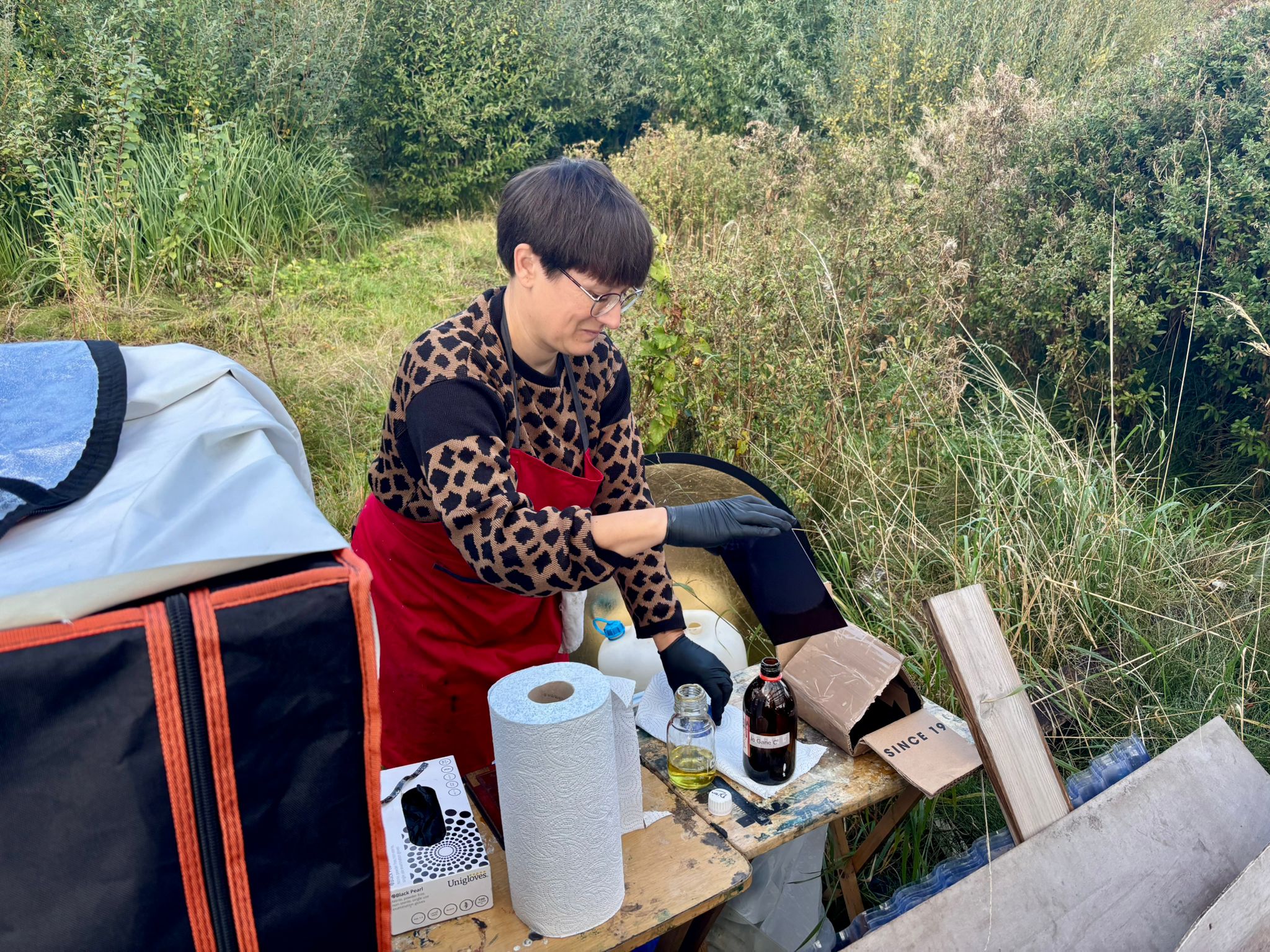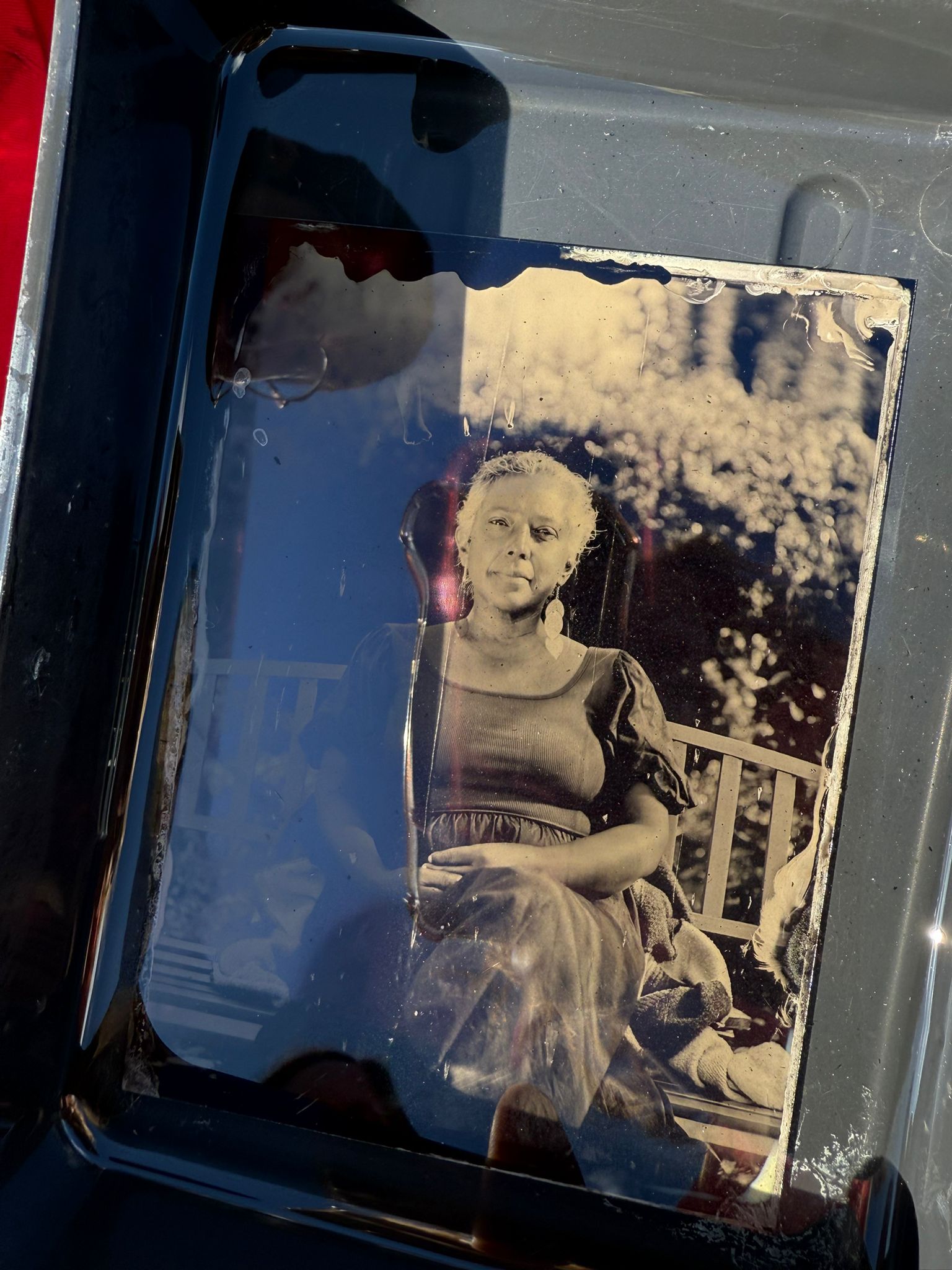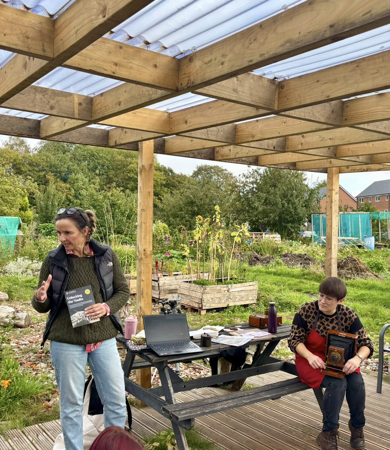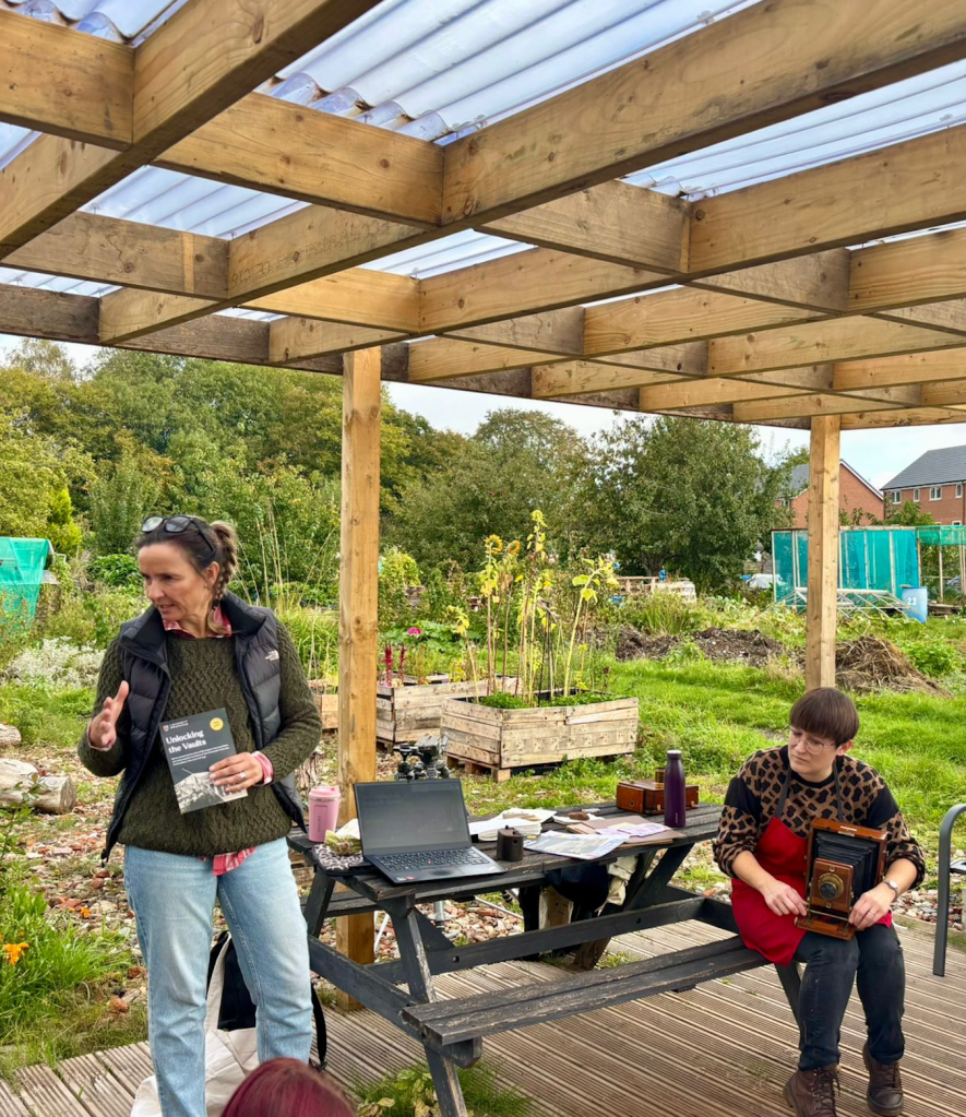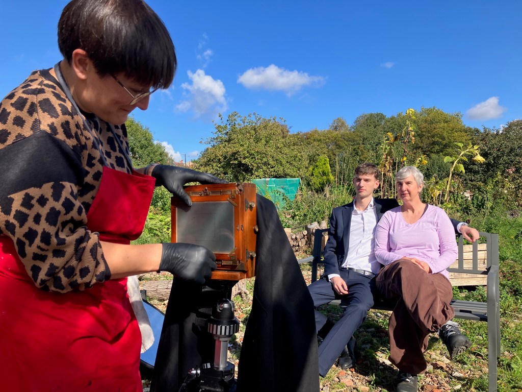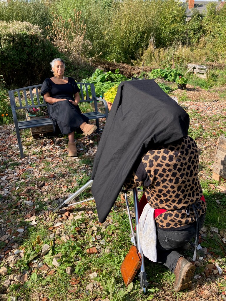On Sunday, organised by the Mothers Who Make an Allotment group, artist-photographer Jo Gane set up her mobile darkroom at the allotment. Jo’s artistic practice uses historical photographic techniques and she was making tin-type portraits of members of the group – which will be exhibited as part of the Unlocking the Vaults project at The Exchange.